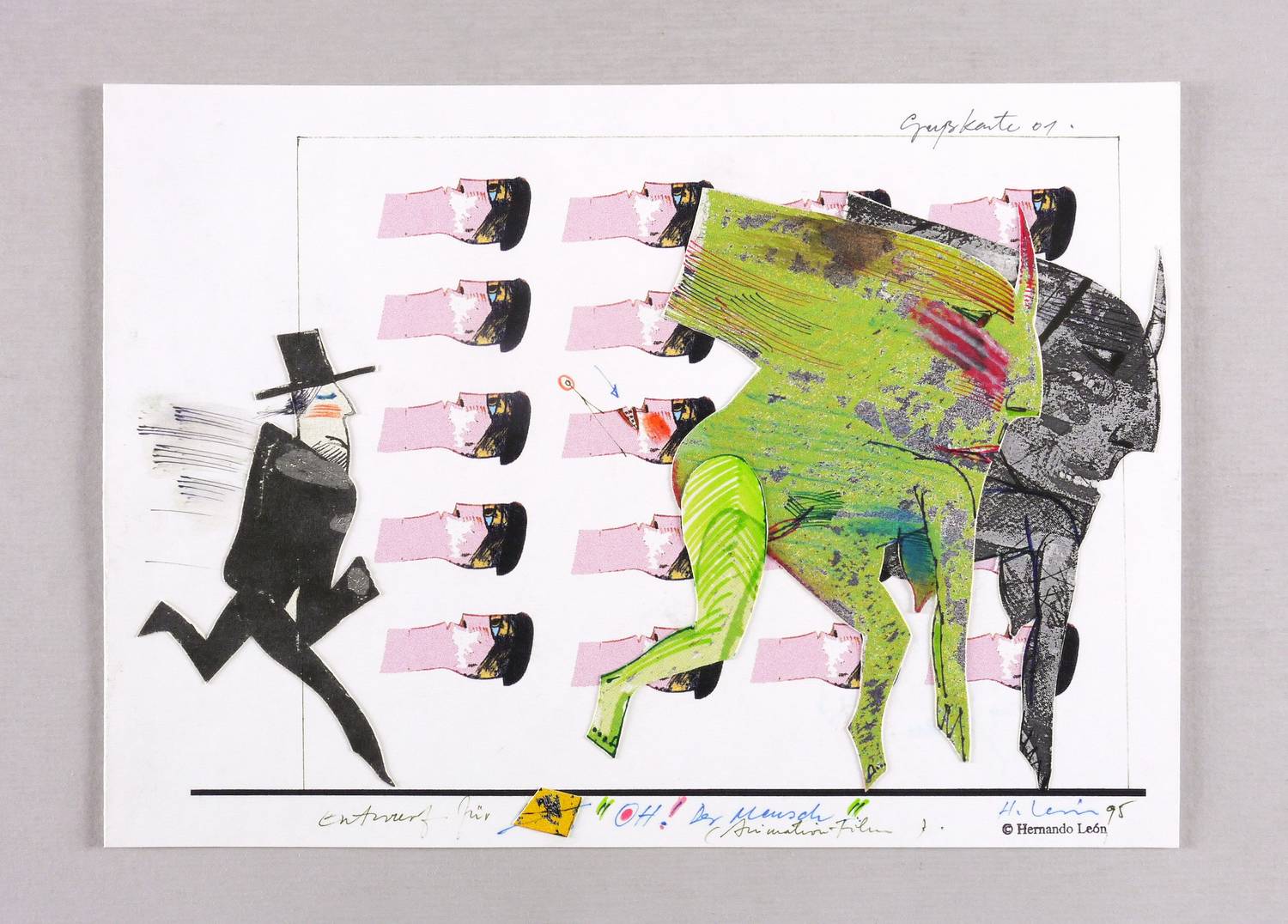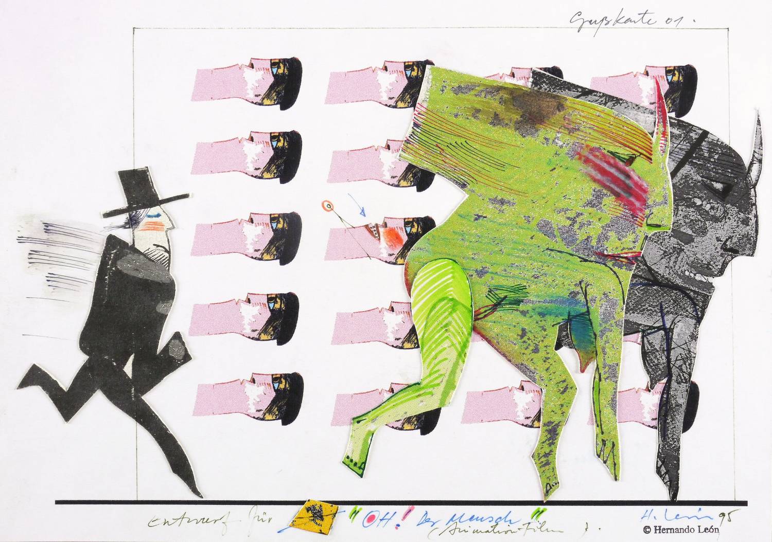 Rechts unten in Bleistift signiert und datiert: ″H. León 95″. Links bezeichnet: ″Entwurf für 'OH! Der Mensch' (Animations-Film)″. – Sehr guter Zustand.