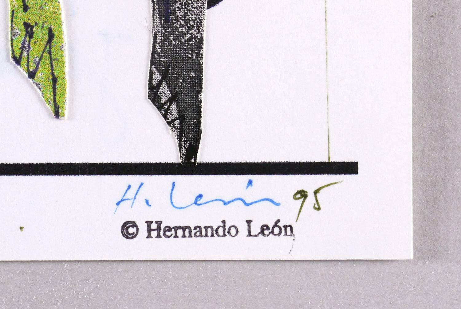 1995. Collage / Papiercollage, darüber Faserstift, auf glattem weißem Velin. – Originale Künstlergrafik, von Hernando León. – Unikat. – 21,1 x 29,5 cm (Darstellung / Blatt).