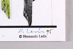Hernando León (*1933 Yungay, lebt in Dresden, Pirna und Santiago de Chile). Eigentlich Juan Hernando León Perez. Chilenischer Maler, Grafiker, Performancekünstler und Regisseur. 1952-58 Studium an der Universidad de Chile in Santiago Wandmalerei und Kunsterziehung, 1958-61 Grafik bei Hans Theo Richter an der Hochschule für Bildende Künste Dresden (HfBK). 1962-64 Lehrauftrag an der Academia Chilena de Bellas Artes in Valdivia in Chile. Danach Dozent an der Universität in Antofagasta. 1968 Mitbegründer des chilenischen Künstlerverbandes in Antofagasta. Ab 1970 Professor an der neu eröffneten Abteilung für architekturbezogene Kunst, ab 1972 Direktor. 1973 während Pinochets Militärputsch Verhaftung, 1974 Emigration in die DDR. 1974-1992 Dozent an der HfBK Dresden. Es entstanden Bühnenbilder (1976 "Mutter Courage" am Nationaltheater Weimar, 1987 "Die Zauberflöte" am Theater Junge Generation Dresden) sowie zahlreiche Wandbilder in Weimar, Bautzen, Schwerin und Dresden. 1996 Ausbau eines Atelierhauses in Pirna bei Dresden. Mitbegründung und Leitung des Museo Internacional de la Gráfica Contemporánea de Chillán (Chile).