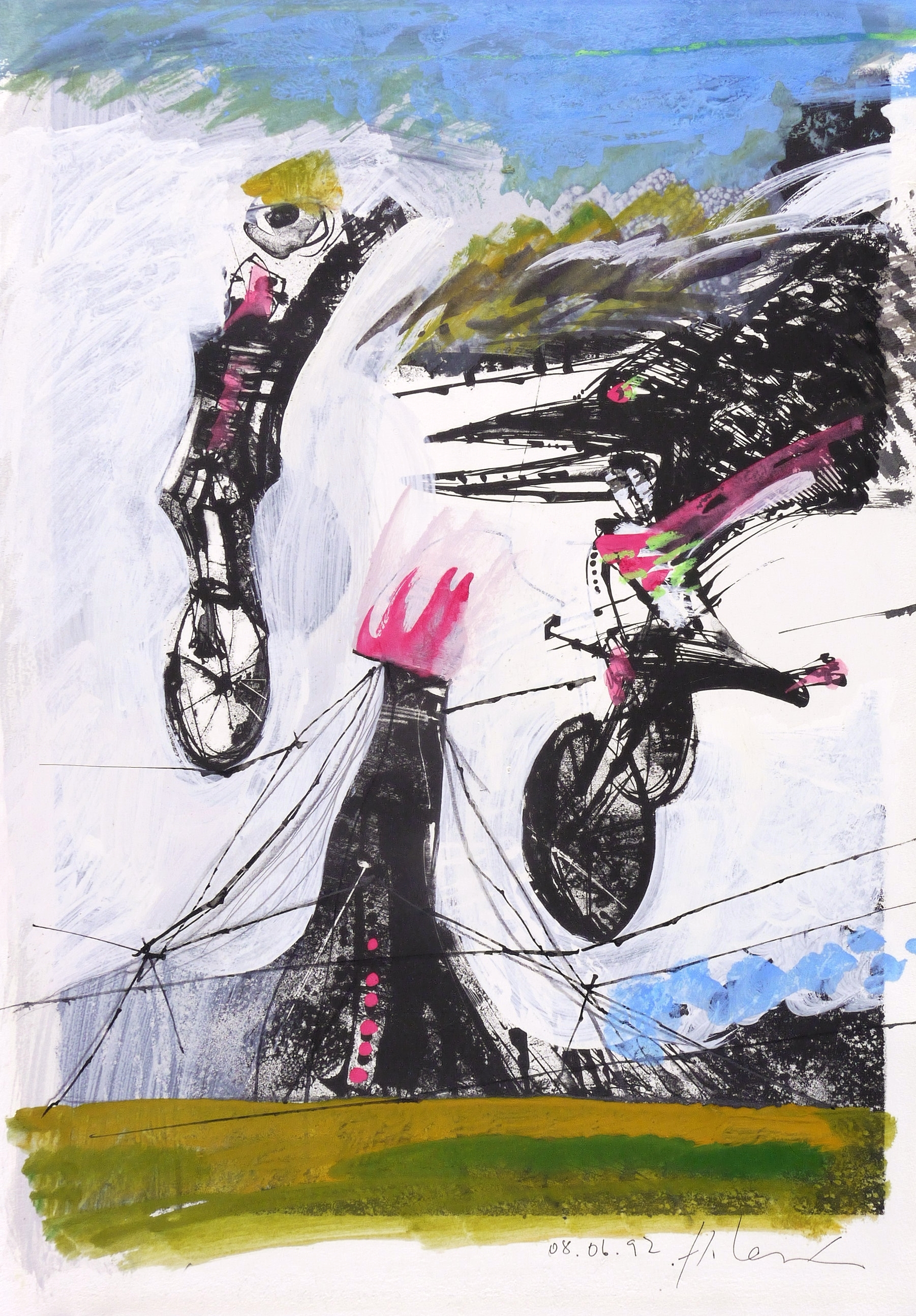 1992. Mischtechnik / Tusche, Aquarell & Deckweiß, über Lithografie in Schwarz, auf weichem schwerem Hahnemühle. – Originale Künstlergrafik, von Hernando León. – Unikat. – 56,5 x 40,0 cm (Darstellung / Blatt).