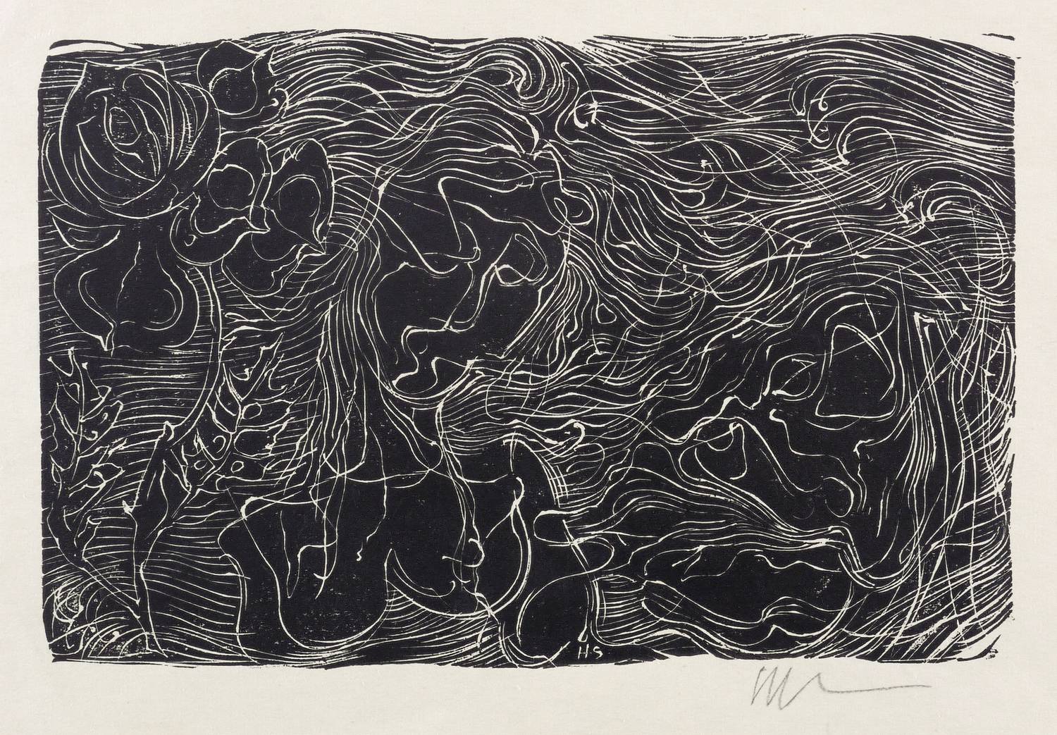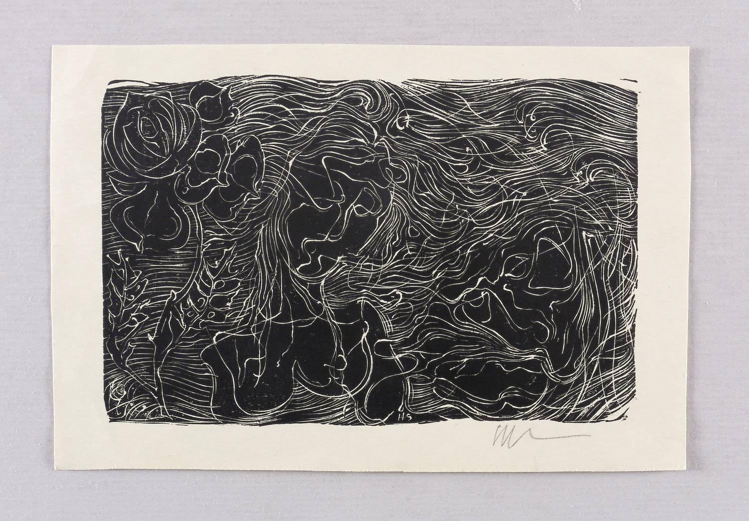 Um 1960. Linolschnitt / Weißlinienschnitt, in Schwarz, auf glattem hellchamois Velin. – Originale Künstlergrafik, von Hans Schulze. – 9,8 x 14,9 cm (Darstellung / Druckbild), 12 x 18 cm (Blatt).