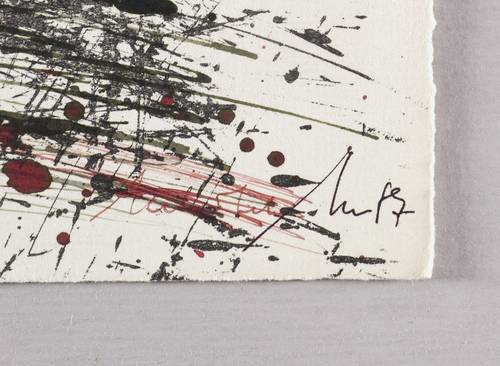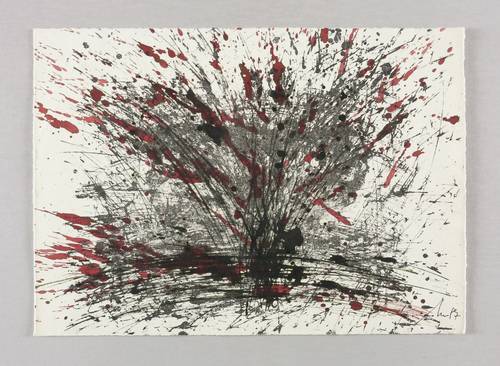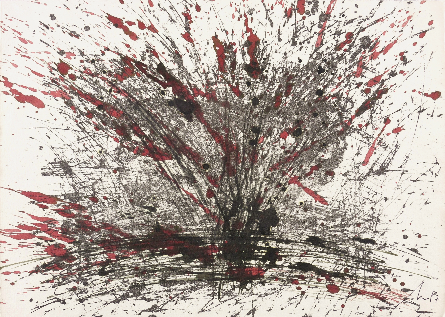 1987. Zeichnung / Pinselzeichnung, in Tusche in Rostrot & Schwarz, über Lithografie, auf hellchamois Velin. – Originale Künstlergrafik, von Bodo Ueberfeld. – Unikat. – 21,0 x 29,5 cm (Darstellung / Blatt).