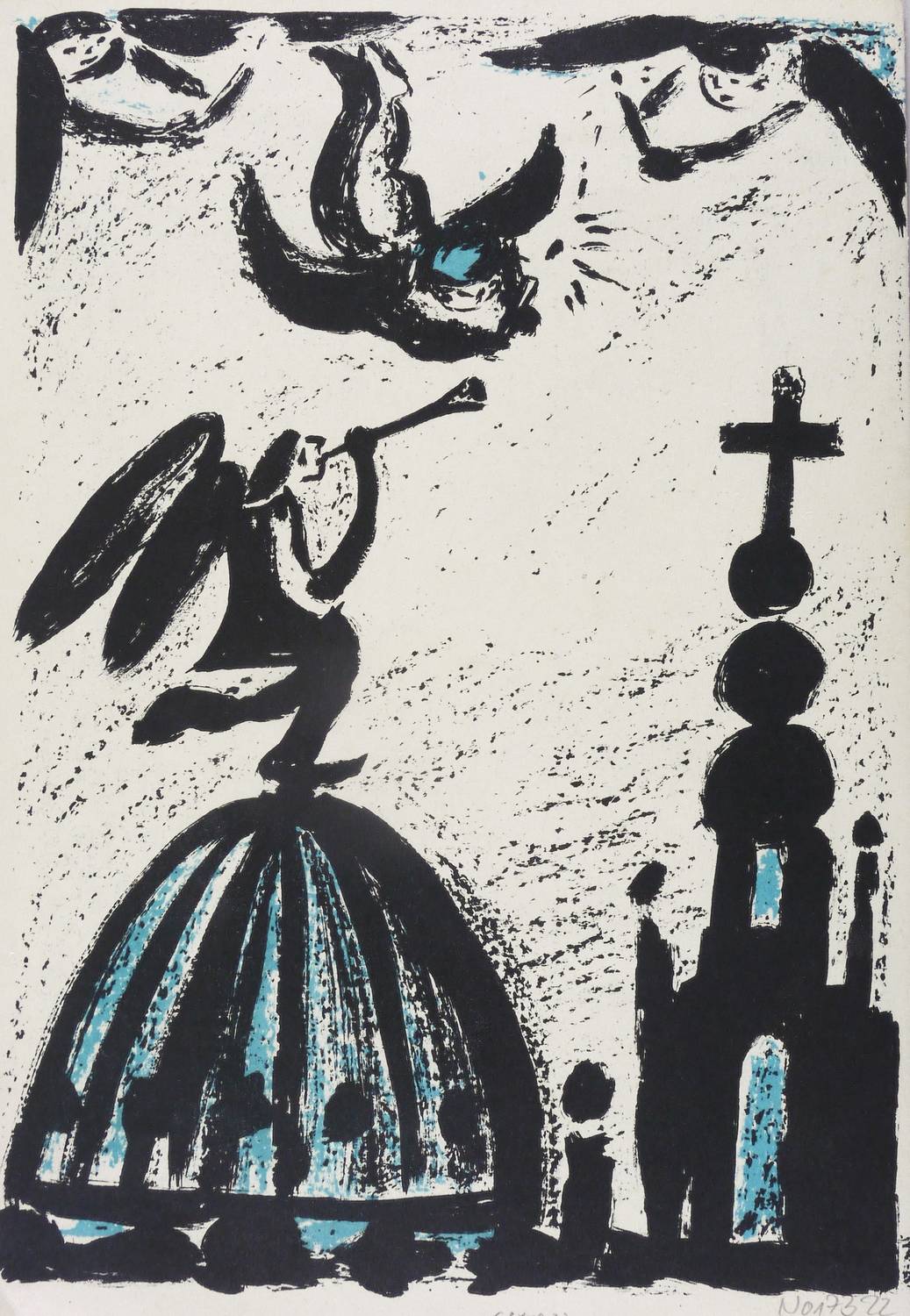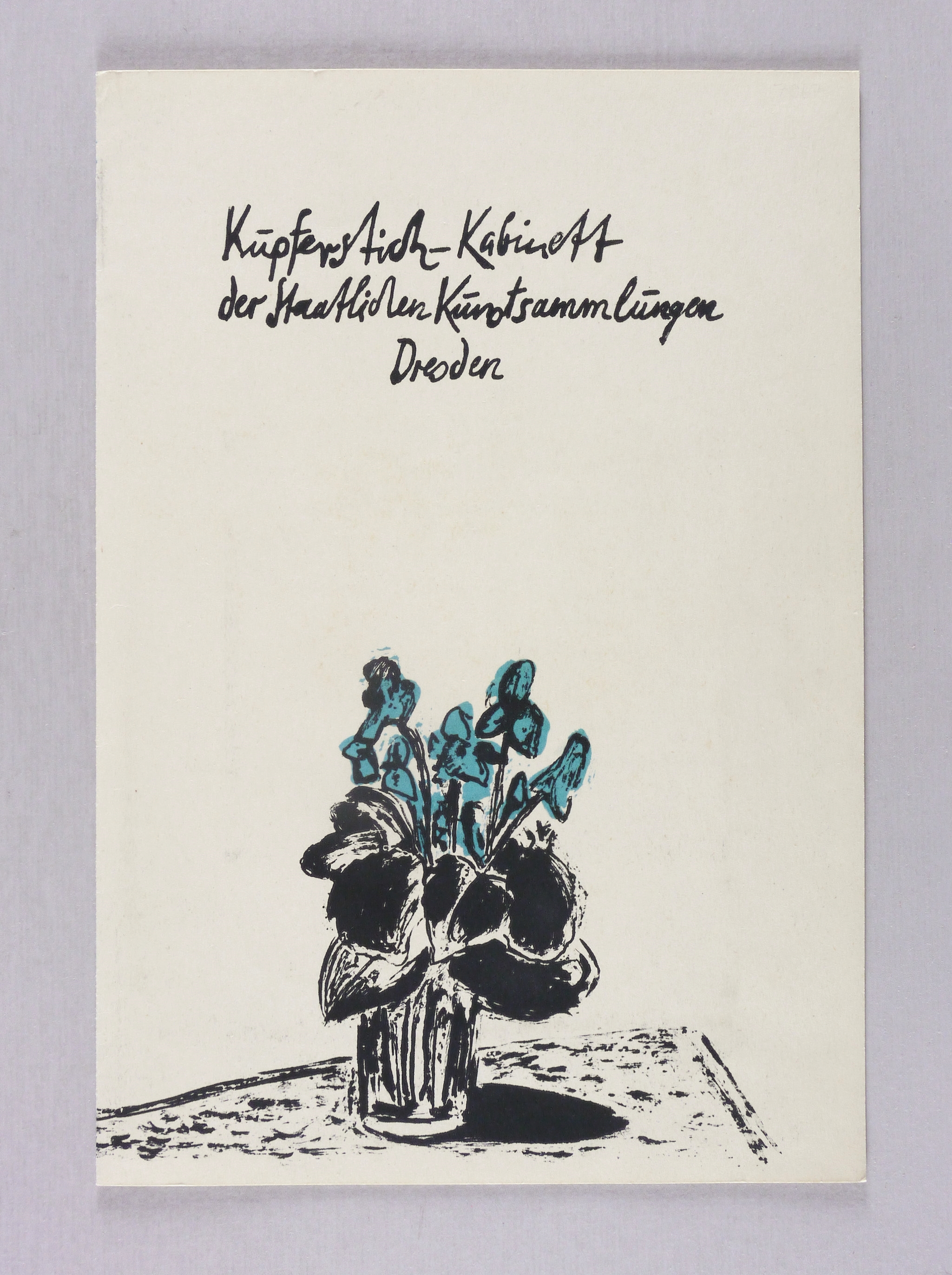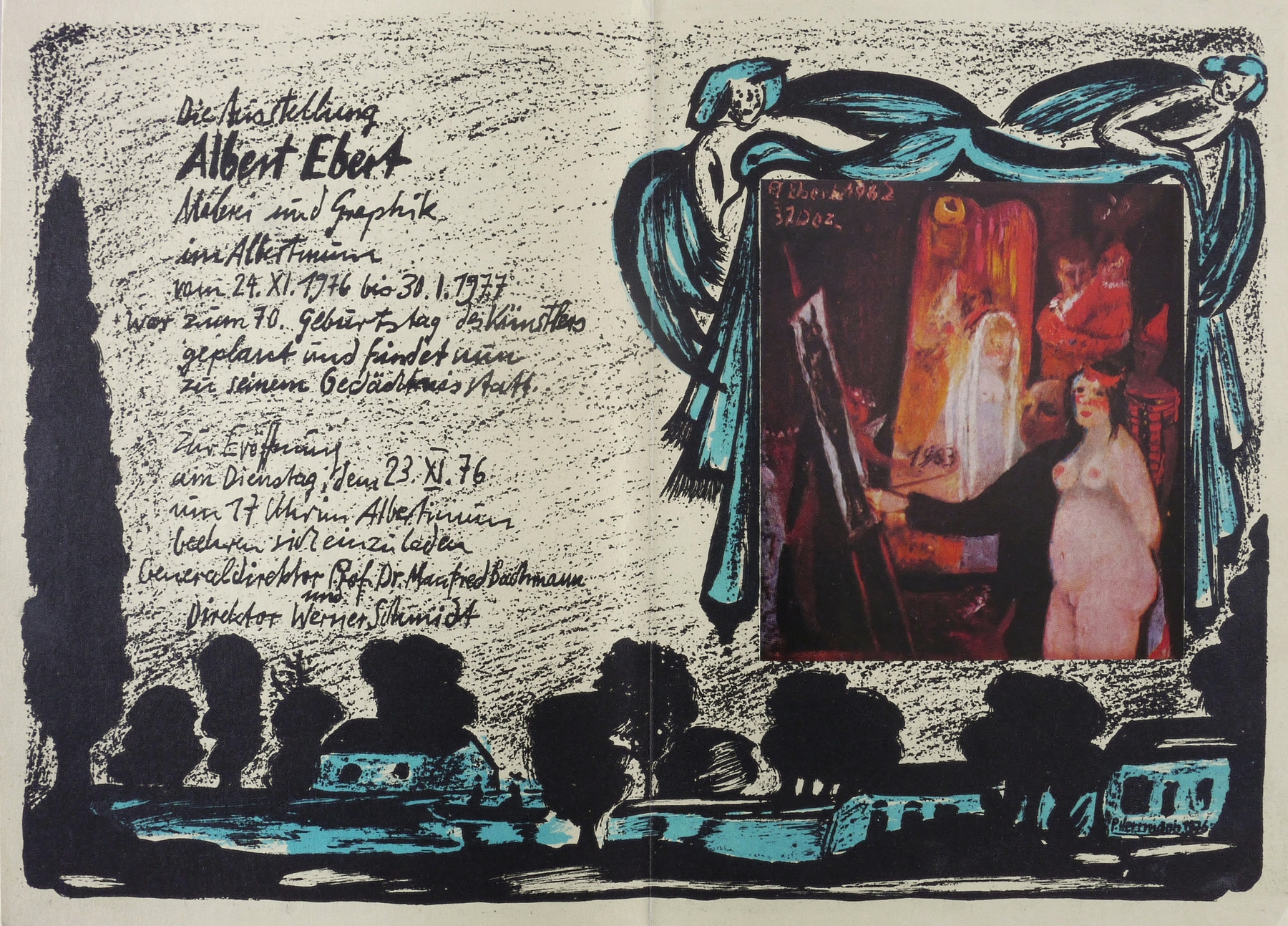 Nicht handsigniert. Im Sieb rechts unten signiert und datiert: P. Herrmann 1976″. Diverse Inschriften. – Klappkarte als Einladung zur Eröffnung der Ausstellung ″Albert Ebert Malerei und Graphik″ im Albertinum am 23.11.1976. – Sehr gut erhalten.