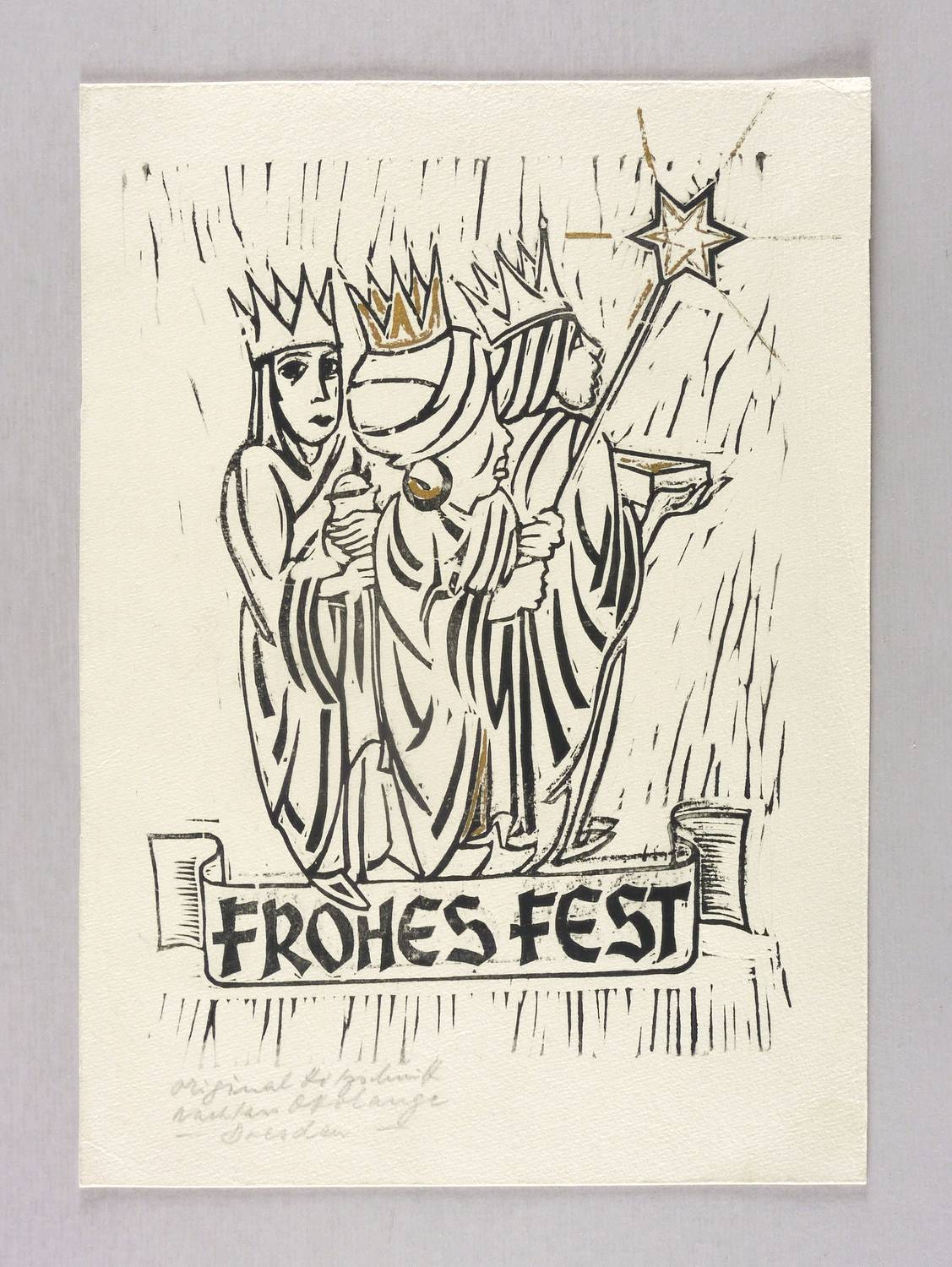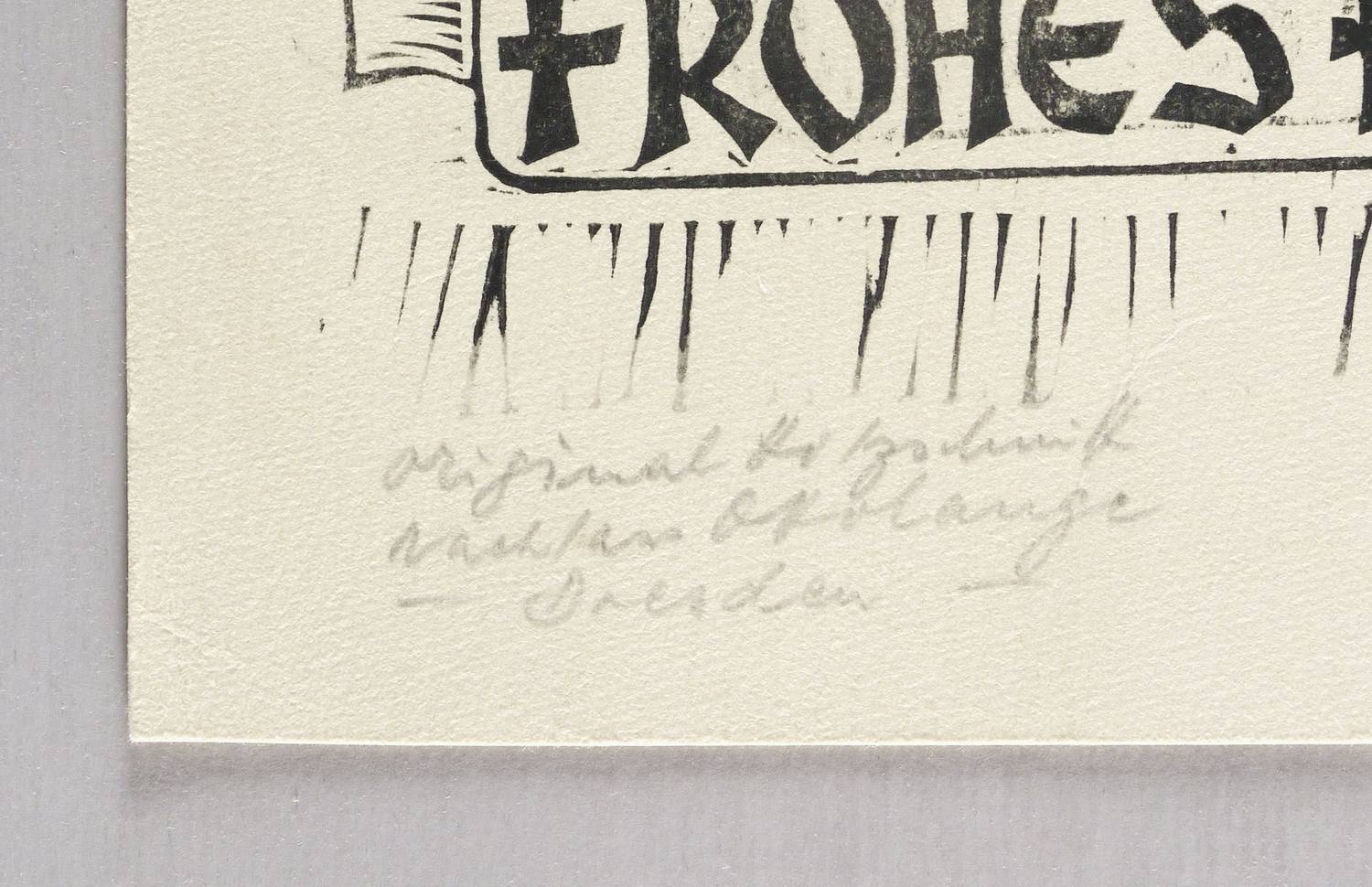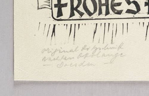 Schönjahn R 105. – Nicht handsigniert. Links unten in Bleistift bezeichnet: ″Original Holzschnitt / Nachlass Otto Lange - Dresden -″. Verso bezeichnet: ″Einladung 1977″. Dazu Widmung. – Postumer Abzug vom originalen Druckstock aus dem Nachlass des Künstlers. – Tadellos erhalten. Sehr guter Zustand.
