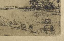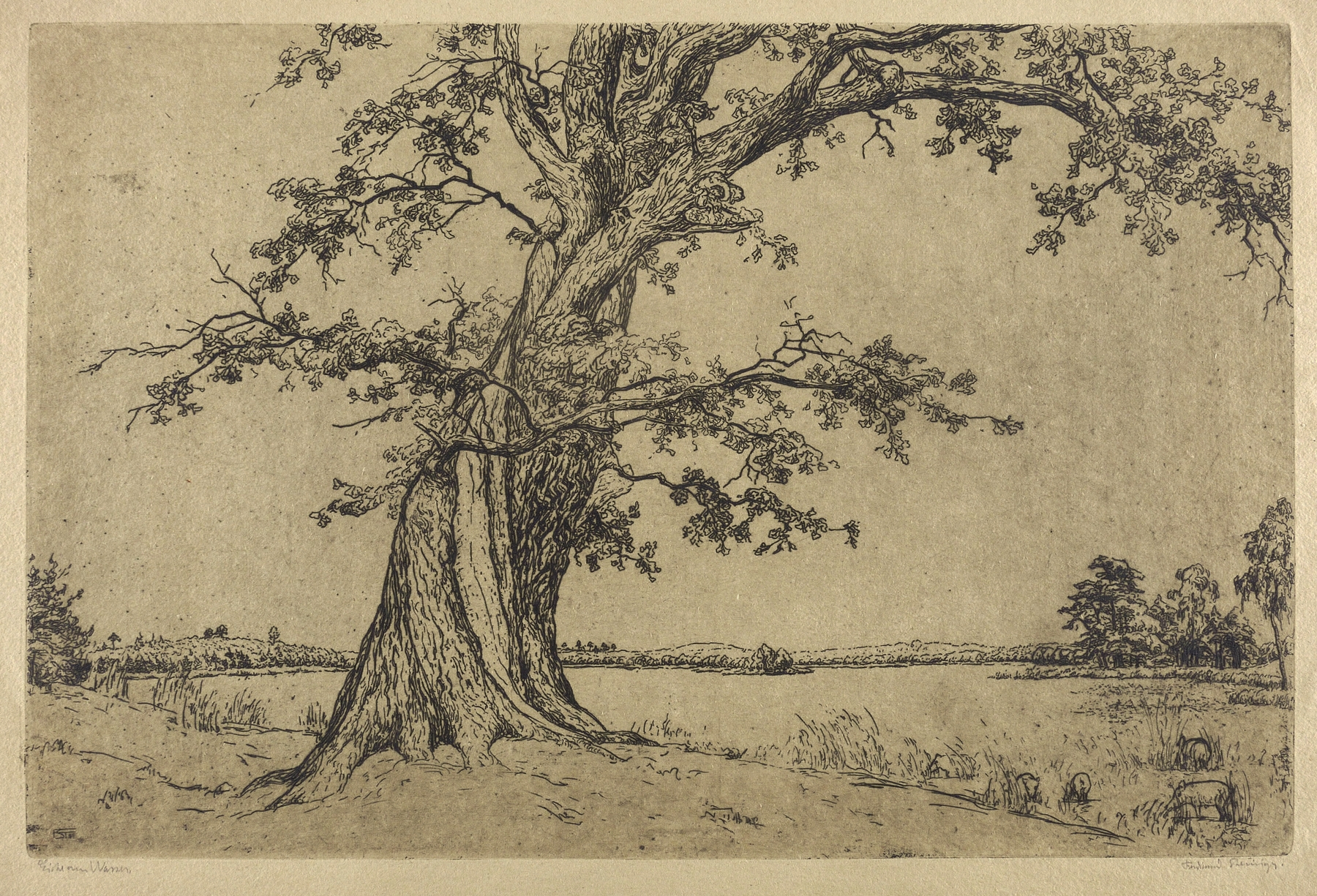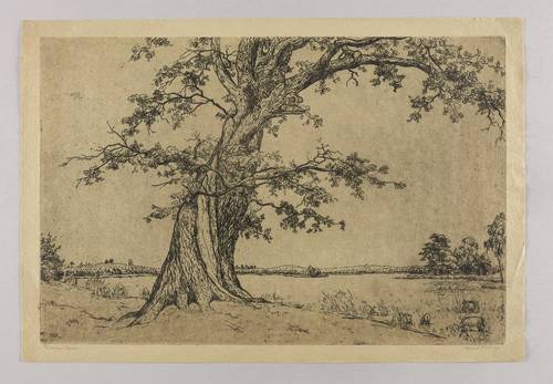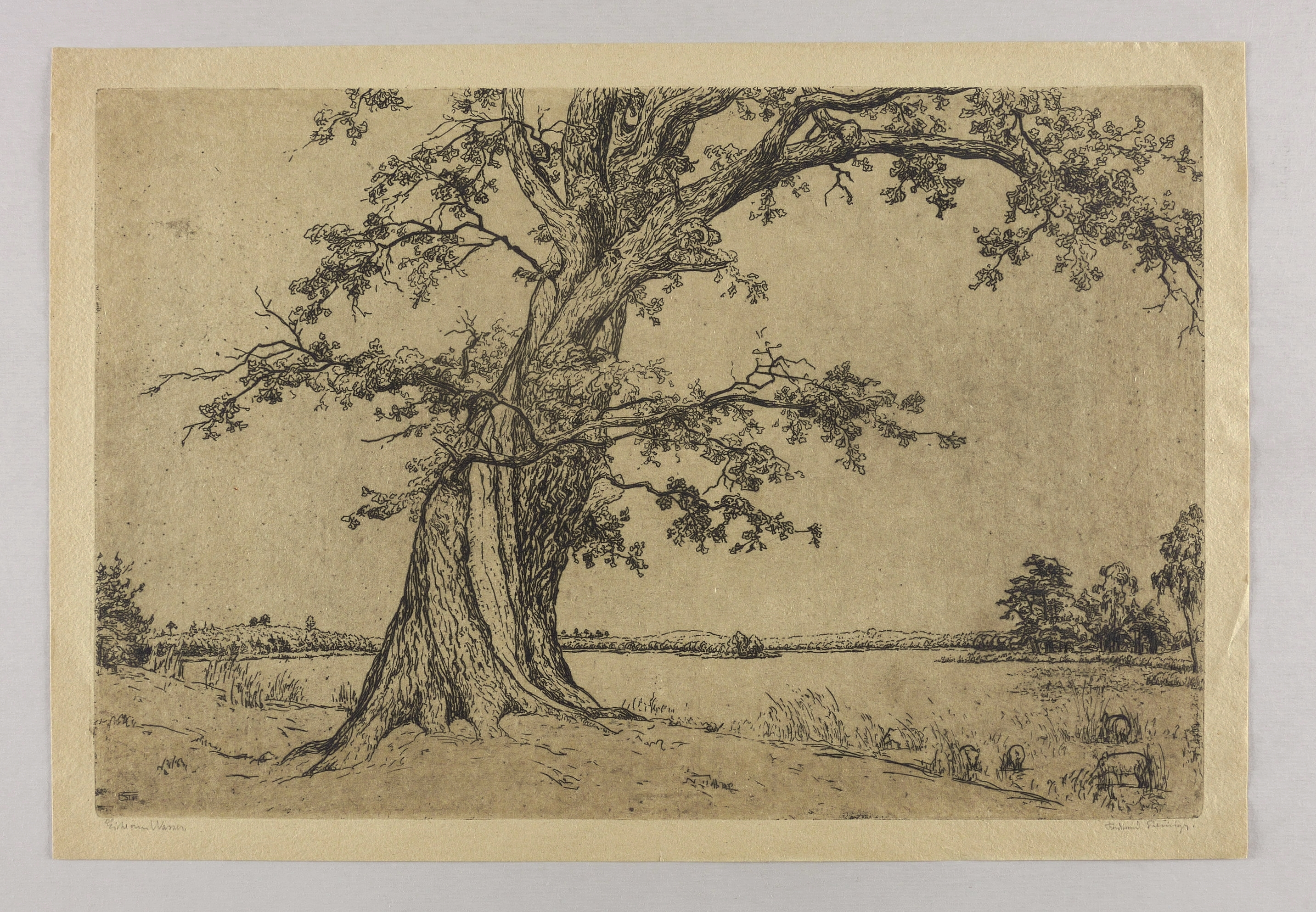 Rechts unten in Bleistift signiert: ″Ferdinand Steiniger.″ Links Titel: ″Eiche am Wasser″. In der Platte links unten Monogramm und Jahr: ″FST 11″. – Sehr guter Zustand.