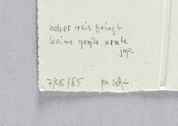 Aus: Graphische Etüden. Grafik-Edition XIII (Leipzig: Reclam 1982). – Links unten in Bleistift mit Auflagennummer bezeichnet, signiert und datiert: ″7/48 / 85 p. schulze″. Darüber Titel: ″Hoher Reis bringt keine große Ernte″. – Sehr guter Zustand.