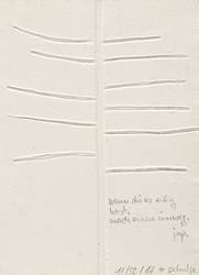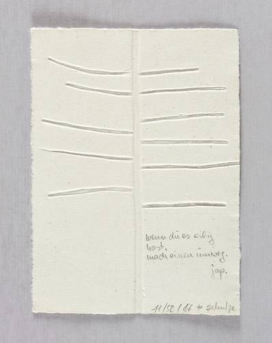 1986. Reliefdruck / Prägedruck, ohne Farben, auf rauem chamois Bütten. – Originale Künstlergrafik, von Fritz Peter Schulze. – Auflage Exemplar Nr. 11750. – 14,7 x 10,8 cm (Darstellung / Blatt).