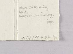 Aus: Graphische Etüden. Grafik-Edition XIII (Leipzig: Reclam 1982). – Rechts unten in Bleistift datiert und signiert: ″86 p. schulze″. Links daneben Auflagenbezeichnung: ″11/50″. Darüber Titel: ″Wenn du es eilig hast, mach einen Umweg″. – Sehr guter Zustand.