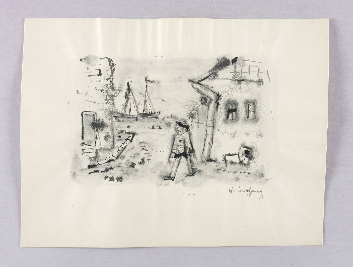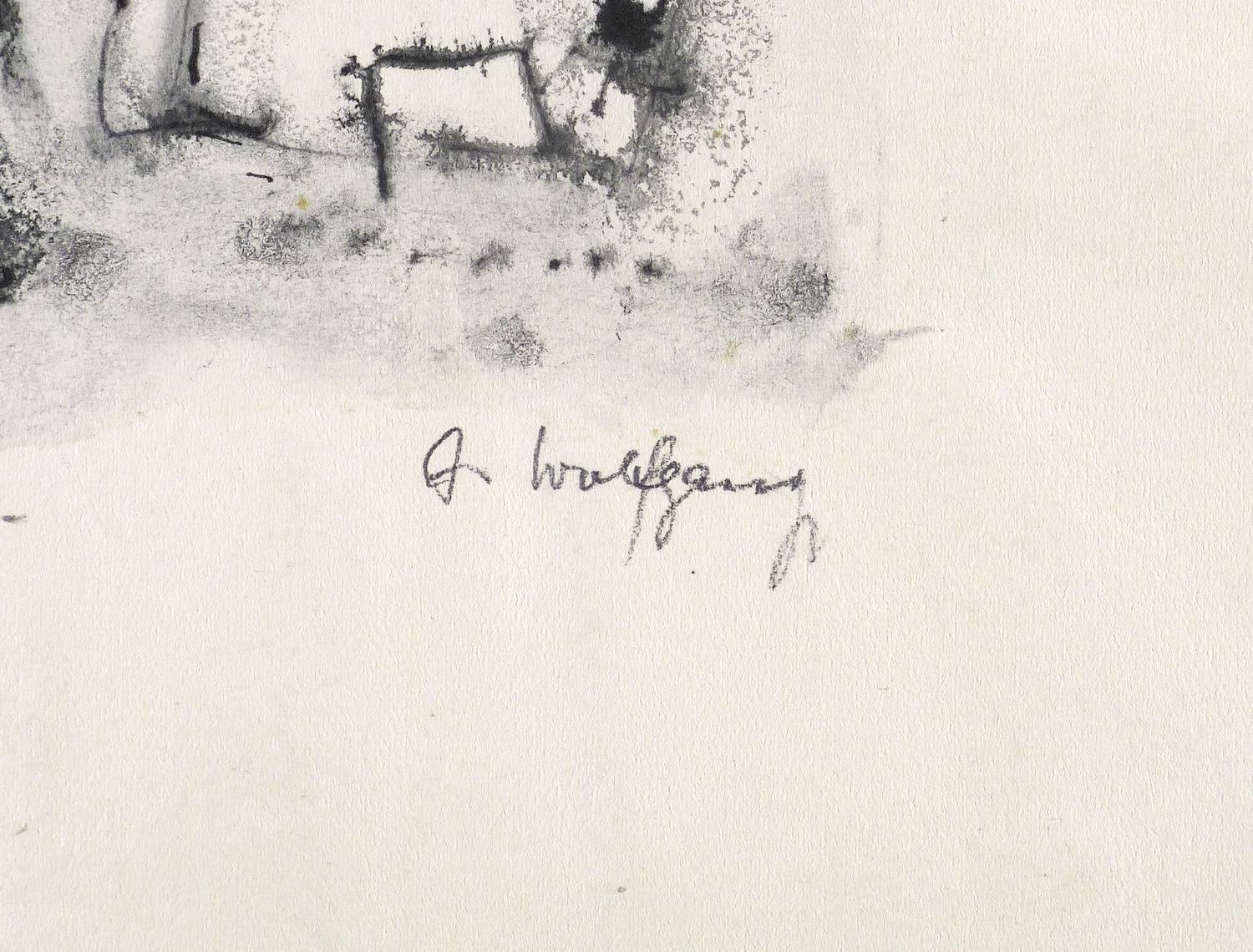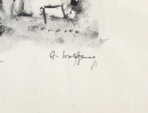 Rechts unten in Bleistift signiert: ″A. Wolfgang″. – Wie ein Aquarell sehr nass gearbeitet, mit häufig zufällig entstandenen Pigment- Verläufen. – Blattränder vom Herstellungsprozess minimal gewellt. Sonst sehr guter Zustand.
