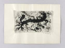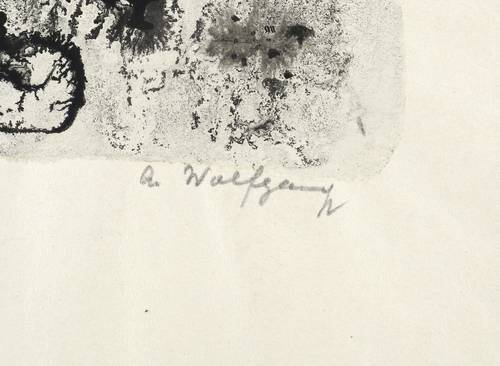 Rechts unten in Bleistift signiert: ″A. Wolfgang″. – Wie ein Aquarell sehr nass gearbeitet, mit häufig zufällig entstandenen Pigment- Verläufen. – Blattränder vom Herstellungsprozess leicht gewellt. Sonst sehr guter Zustand.