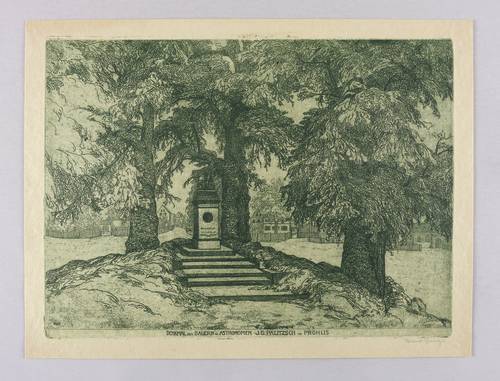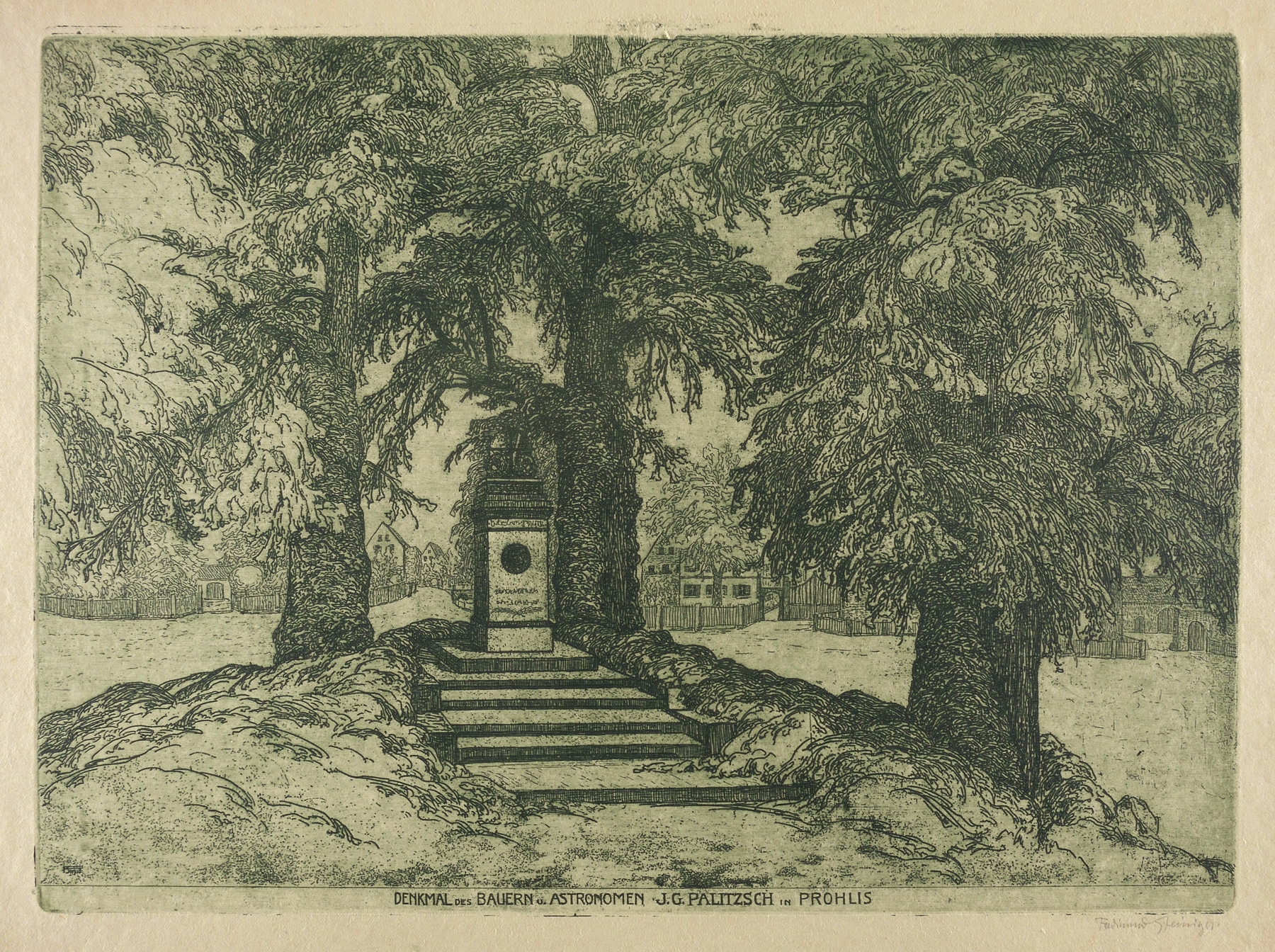 Rechts unten in Bleistift signiert: ″Ferdinand Steiniger.″ In der Platte rechts unten Monogramm und Jahr: ″FST 1915″. Im unteren Plattenrand Inschrift: ″DENKMAL DES BAUERN U. ASTRONOMEN J.G. PALITZSCH IN PROHLIS″. – Sehr guter Zustand.