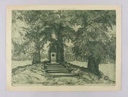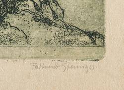1915. Radierung / Strichätzung, mit Plattenton, in Dunkelgrün, auf gelbem Velin. – Originale Künstlergrafik, von Ferdinand Steiniger. – 28,8 x 39,3 cm (Darstellung / Platte), 33 x 43 cm (Blatt).