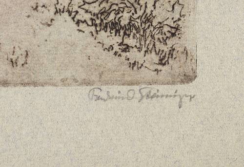 Rechts unten in Bleistift signiert: ″Ferdinand Steiniger.″ Links Titel: ″Burgruine Greifenstein″. In der Platte links unten Monogramm und Jahr: ″FSt 1917″. – Sehr guter Zustand.