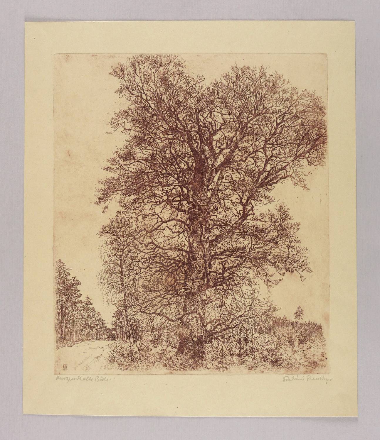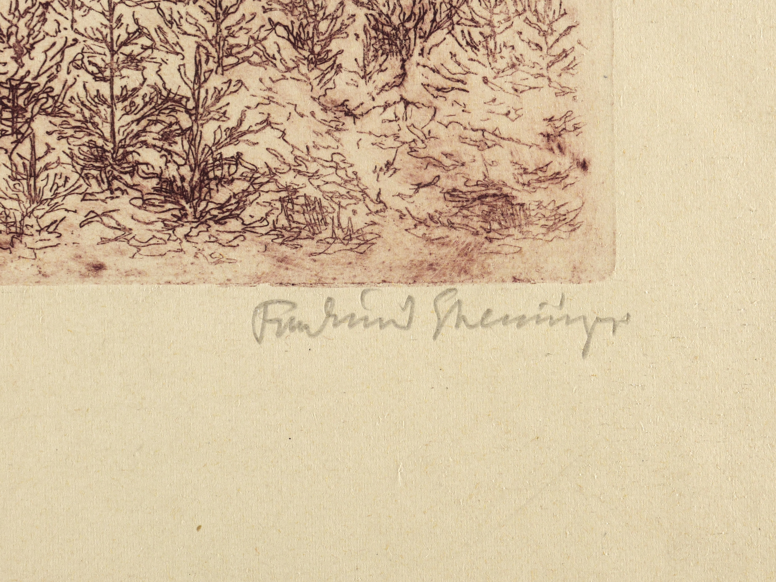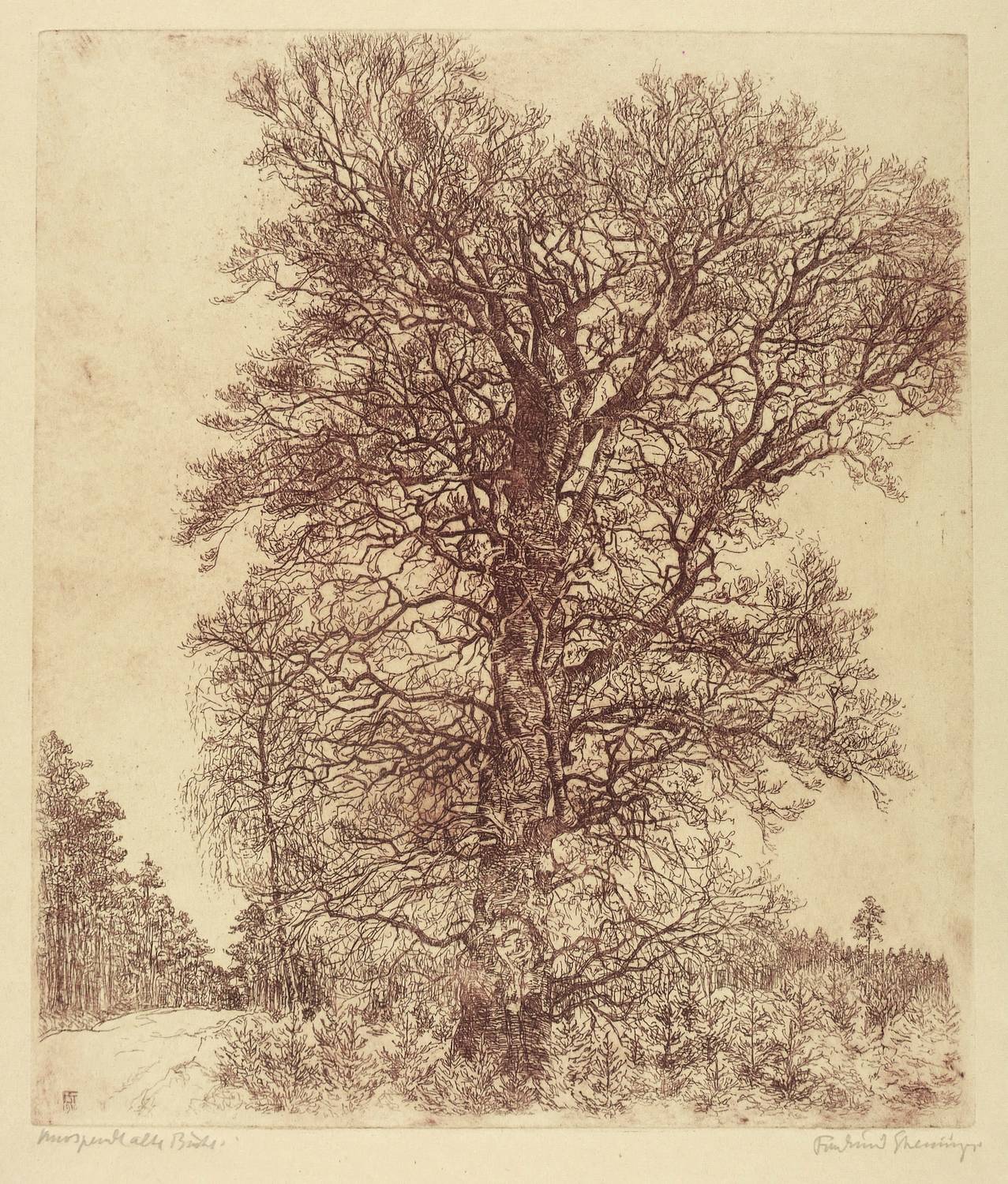Rechts unten in Bleistift signiert: ″Ferdinand Steiniger.″ Links Titel: ″Knospende alte Buche″. In der Platte links unten Monogramm und Jahr: ″FST 1910″. – Sehr guter Zustand.