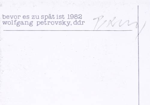 Wolfgang Petrovsky (*1947 Hainsberg, lebt und arbeitet in Hainsberg und Bitterfeld). Deutscher Maler, Grafiker und Projektkünstler. 1966-70 Studium am Institut der Kunsterziehung an der Karl-Marx-Universität Leipzig. Seit 1979 freischaffender Künstler. 1979 Studienreise nach Mittelasien (Sowjetunion) und Beginn des "Bitterfeldprojekts". Umsetzung politischer Themen: 1980 Postkartenserie "Signale" gegen Raketenstationierung in Ost und West, 1982 Projekt "aktion=hoffnung", 1983 Buch-Aktion "FREEZE". Seit 1982 Freundschaft und zeitweilige Zusammenarbeit mit dem Maler und Grafiker Frank Voigt. 1986 Postkartenprojekt "made in germany und anderswo / für Victor Klemperer". 1987 Postkartenserie zur Perestroika "DA". 1989 Mail-Art-Aktion "Erinnerung 1. September 1939". 1989 Mitbegründer des Kunstvereins Bitterfeld-Wolfen und Mitinitiator des Aufrufs "Künstler für Bitterfeld". 1990 Arbeitsaufenthalt in Japan. 1990-93 Lehraufträge an den Hochschulen für Bildende Künste in Dresden und Hamburg sowie an der Fakultät Architektur der Technischen Universität Dresden. 1990/91 und '94 Beteiligung an den Projekten "Fahne" in der Villa Streccius des Kunstvereins Landau und "Flagge zeigen" der Edition Staeck Heidelberg. 1996 Arbeit an Collagen zu Kurt Heilbut. 2000 Studienaufenthalt auf Schloss Wiepersdorf mit dem Komponisten Hartmut Dorschner, Arbeit am Projekt "BILD-TEXT-KLANG-KOMPOSITIONEN". 2000 Artist in Residence der Universität Erfurt.