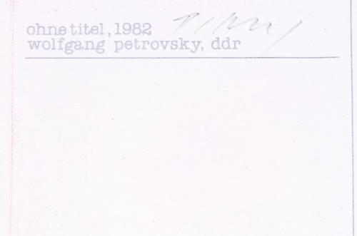 Wolfgang Petrovsky (*1947 Hainsberg, lebt und arbeitet in Hainsberg und Bitterfeld). Deutscher Maler, Grafiker und Projektkünstler. 1966-70 Studium am Institut der Kunsterziehung an der Karl-Marx-Universität Leipzig. Seit 1979 freischaffender Künstler. 1979 Studienreise nach Mittelasien (Sowjetunion) und Beginn des "Bitterfeldprojekts". Umsetzung politischer Themen: 1980 Postkartenserie "Signale" gegen Raketenstationierung in Ost und West, 1982 Projekt "aktion=hoffnung", 1983 Buch-Aktion "FREEZE". Seit 1982 Freundschaft und zeitweilige Zusammenarbeit mit dem Maler und Grafiker Frank Voigt. 1986 Postkartenprojekt "made in germany und anderswo / für Victor Klemperer". 1987 Postkartenserie zur Perestroika "DA". 1989 Mail-Art-Aktion "Erinnerung 1. September 1939". 1989 Mitbegründer des Kunstvereins Bitterfeld-Wolfen und Mitinitiator des Aufrufs "Künstler für Bitterfeld". 1990 Arbeitsaufenthalt in Japan. 1990-93 Lehraufträge an den Hochschulen für Bildende Künste in Dresden und Hamburg sowie an der Fakultät Architektur der Technischen Universität Dresden. 1990/91 und '94 Beteiligung an den Projekten "Fahne" in der Villa Streccius des Kunstvereins Landau und "Flagge zeigen" der Edition Staeck Heidelberg. 1996 Arbeit an Collagen zu Kurt Heilbut. 2000 Studienaufenthalt auf Schloss Wiepersdorf mit dem Komponisten Hartmut Dorschner, Arbeit am Projekt "BILD-TEXT-KLANG-KOMPOSITIONEN". 2000 Artist in Residence der Universität Erfurt.