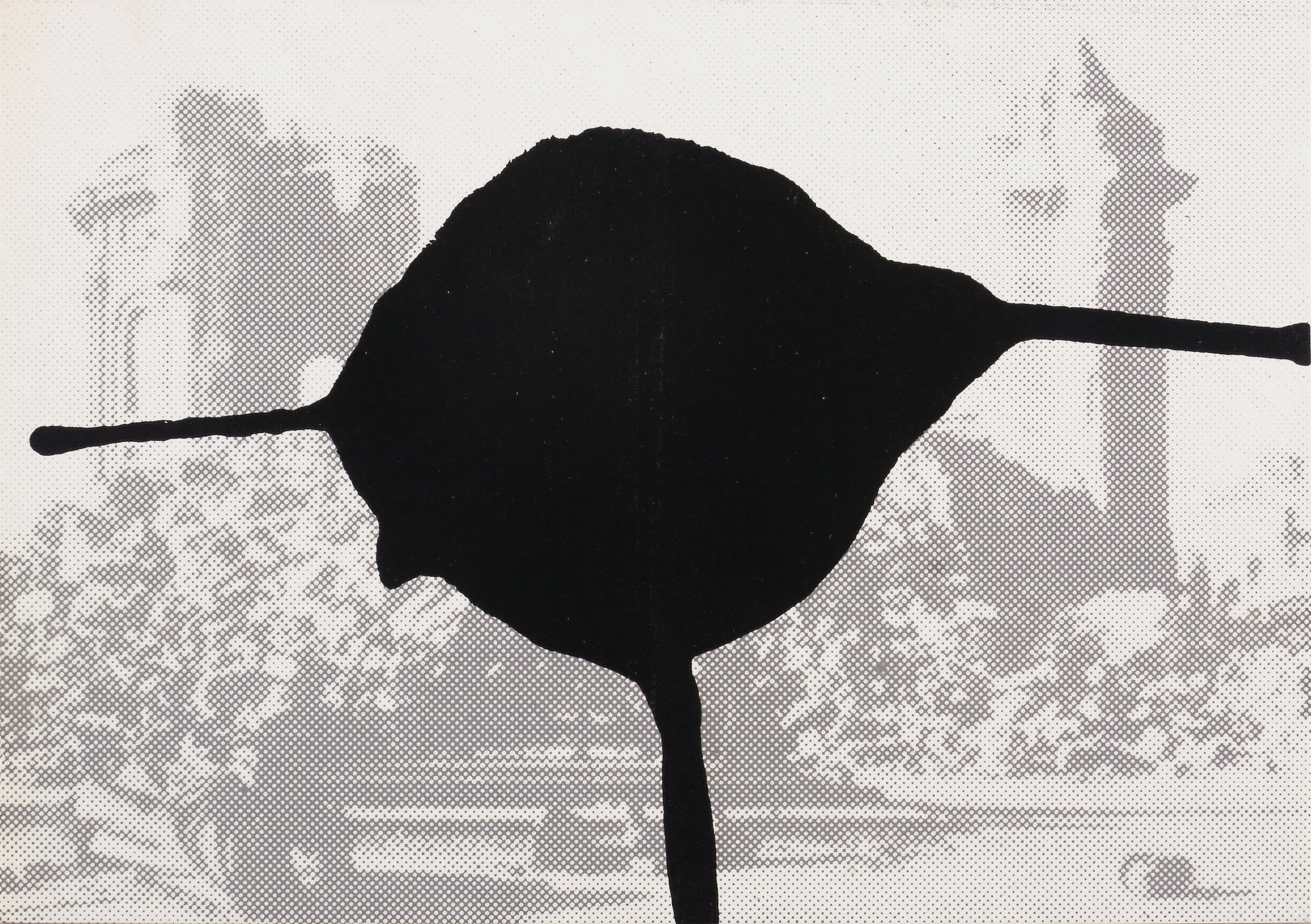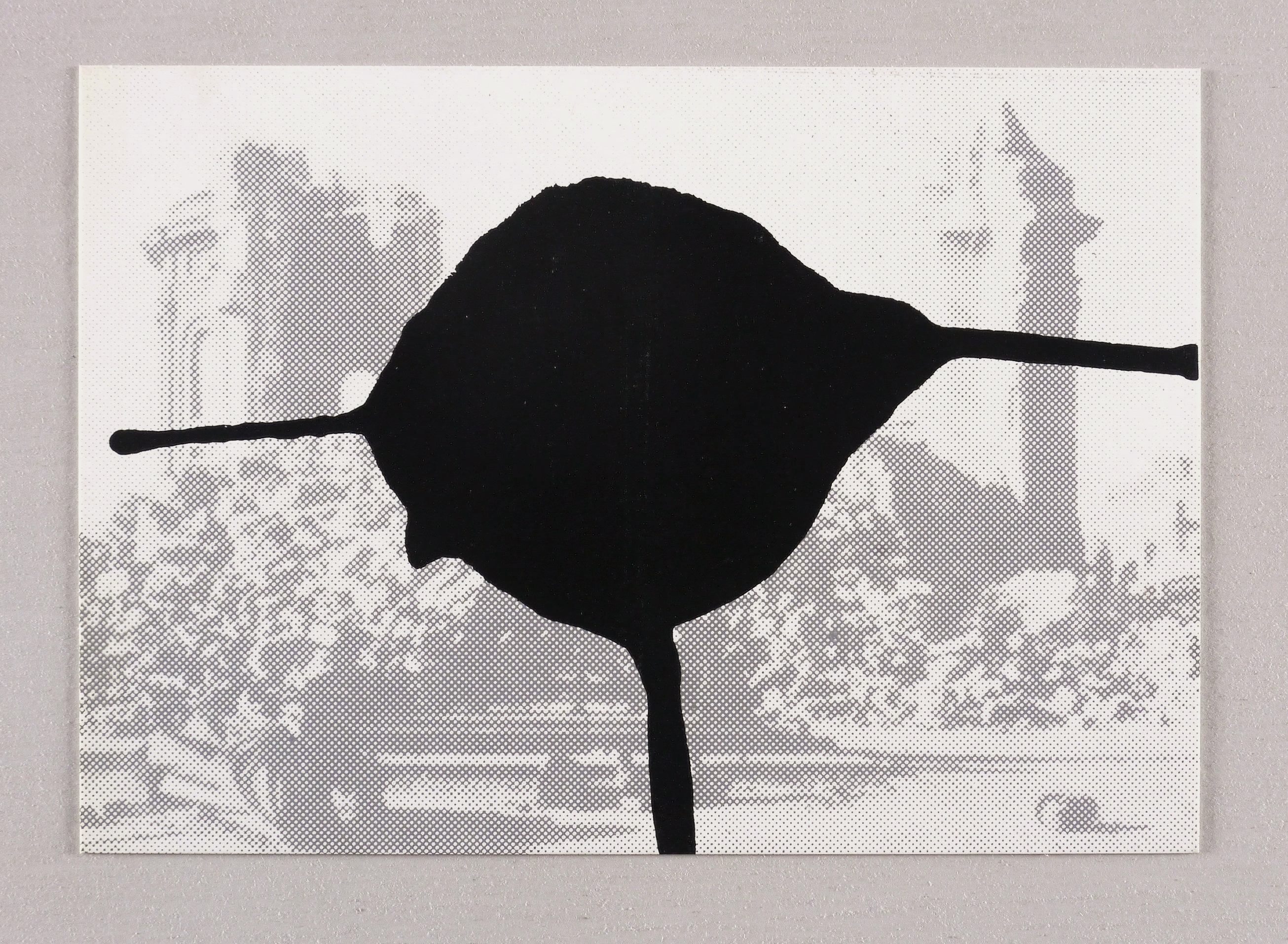 1982. Farbsiebdruck / Farbserigrafie, in Grau & Schwarz, auf weißem Karton. – Originale Künstlergrafik, von Wolfgang Petrovsky. – 10,3 x 14,6 cm (Darstellung / Blatt).