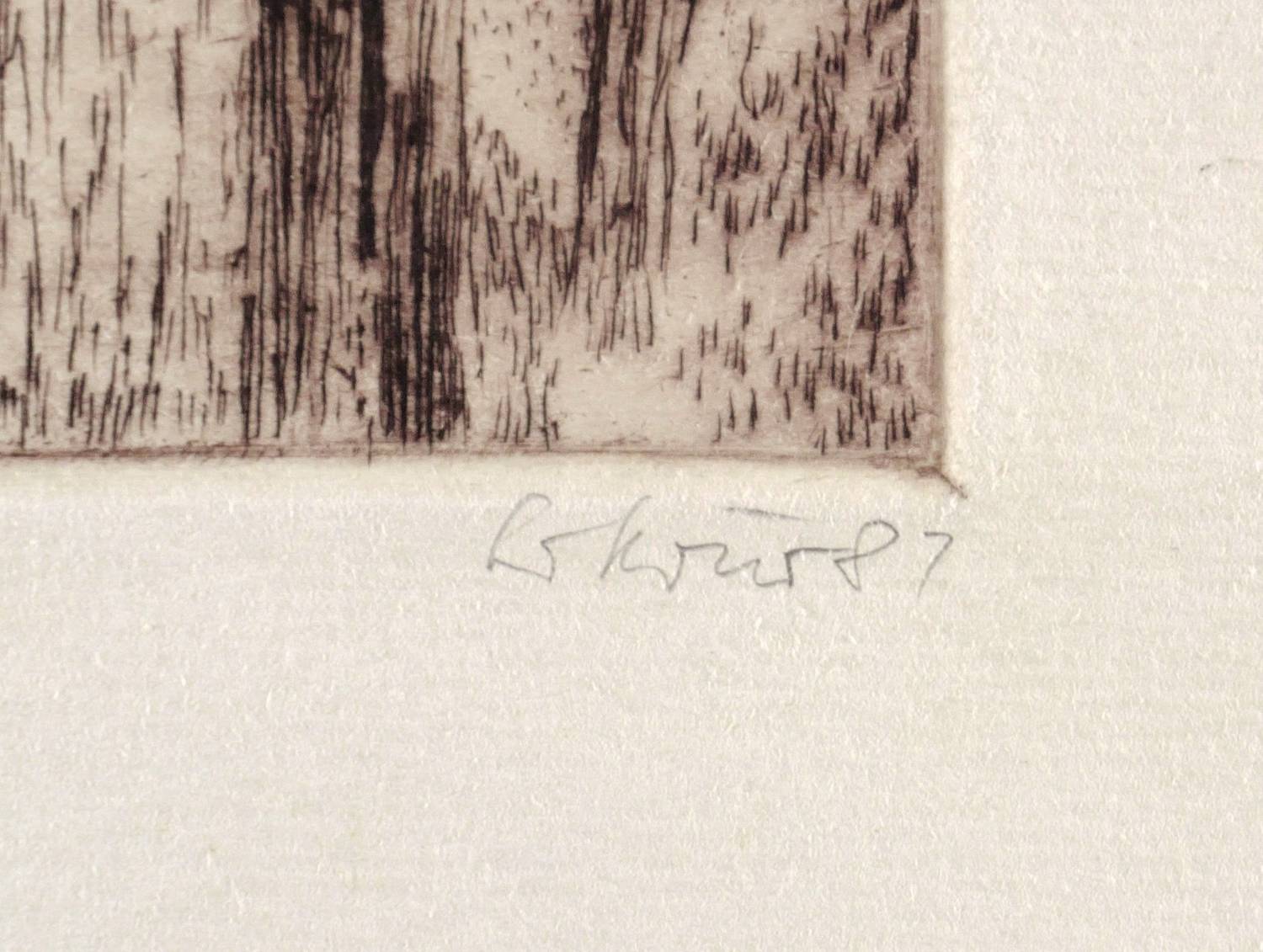 1981. Radierung / Strichätzung & Kaltnadel, in Schwarzviolett, auf chamois Velinkarton. – Originale Künstlergrafik, von Gottfried Körner. – Auflage Exemplar Nr. 10/25. – 9,8 x 14,8 cm (Darstellung / Platte), 16 x 21 cm (Blatt).