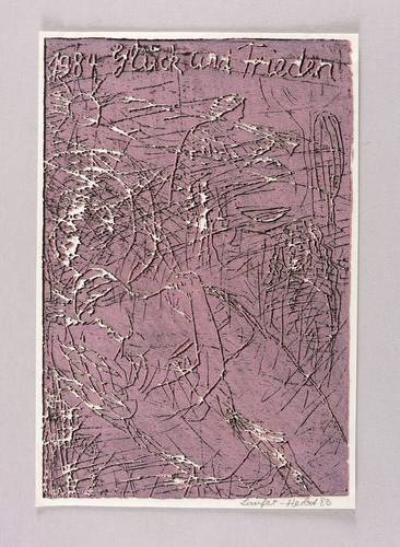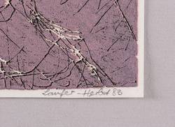 1983. Farblinolschnitt, in Violett & Schwarz, auf hellchamois Velin. – Originale Künstlergrafik, von Maria Laufer-Herbst. – 21,4 x 14,4 cm (Darstellung / Druckbild), 22,1 x 15,0 cm (Blatt).