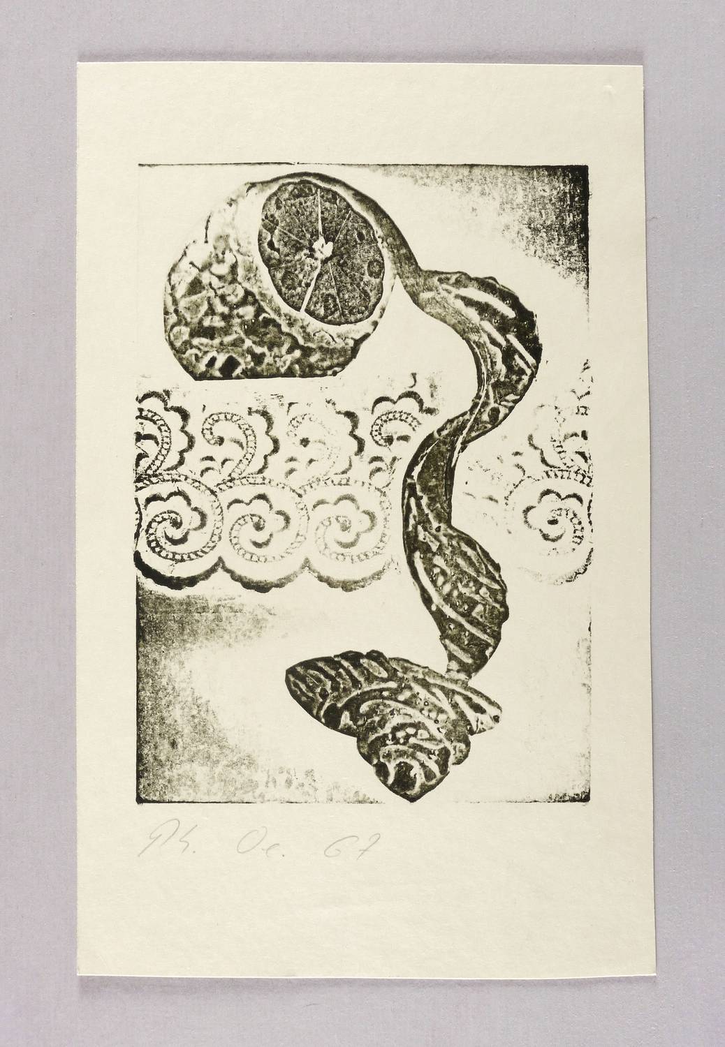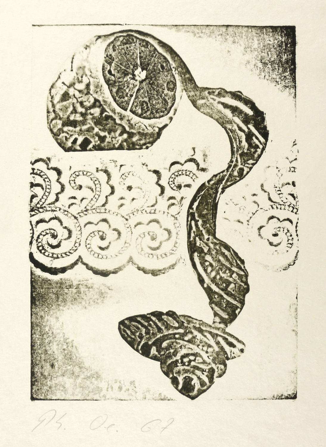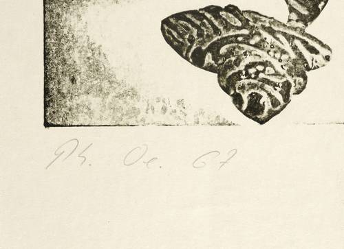 1967. Materialdruck, in Schwarz, auf hellchamois Velinkarton. – Originale Künstlergrafik, von Philip Oeser. – 19,9 x 14,2 cm (Darstellung / Platte), 29 x 18 cm (Blatt).