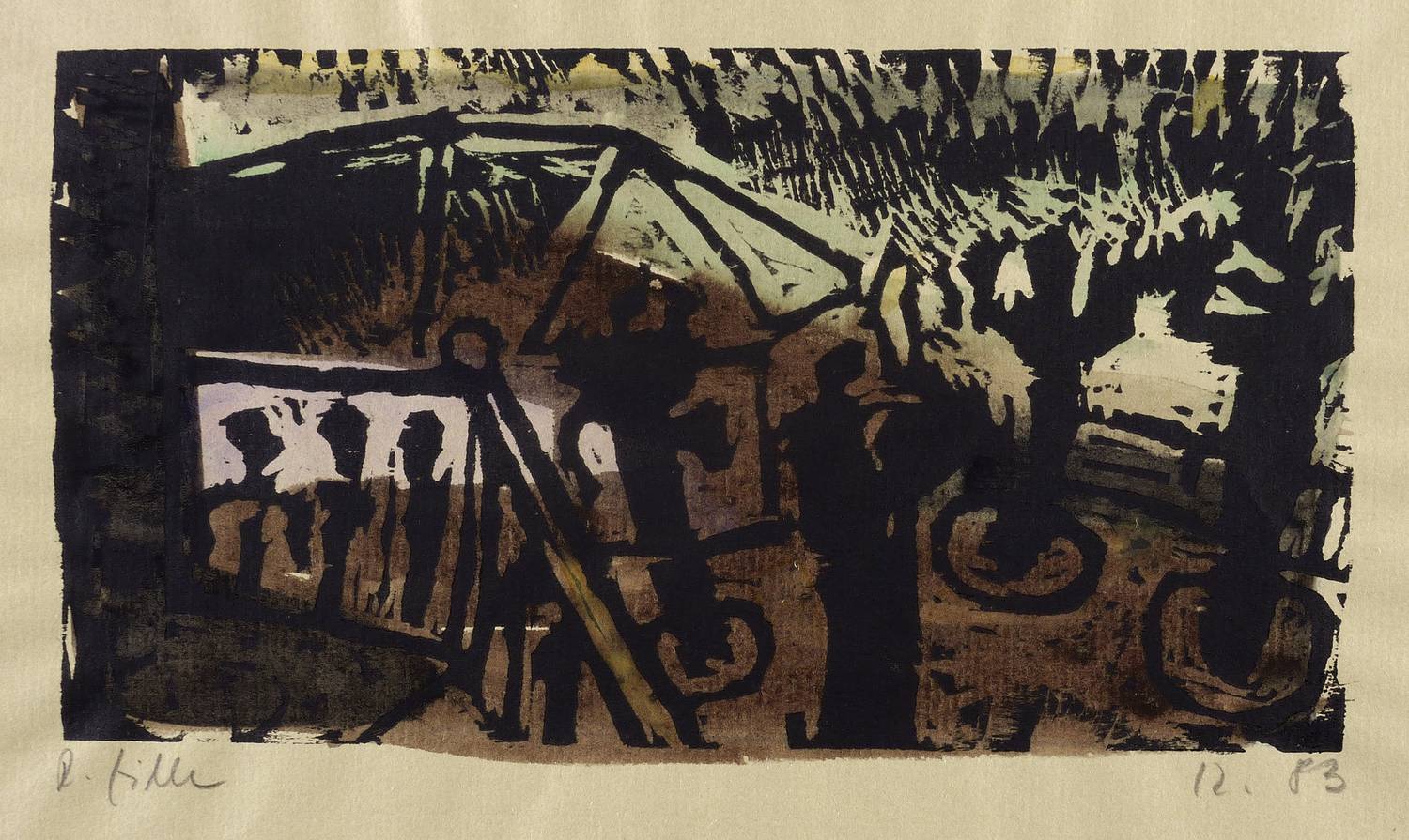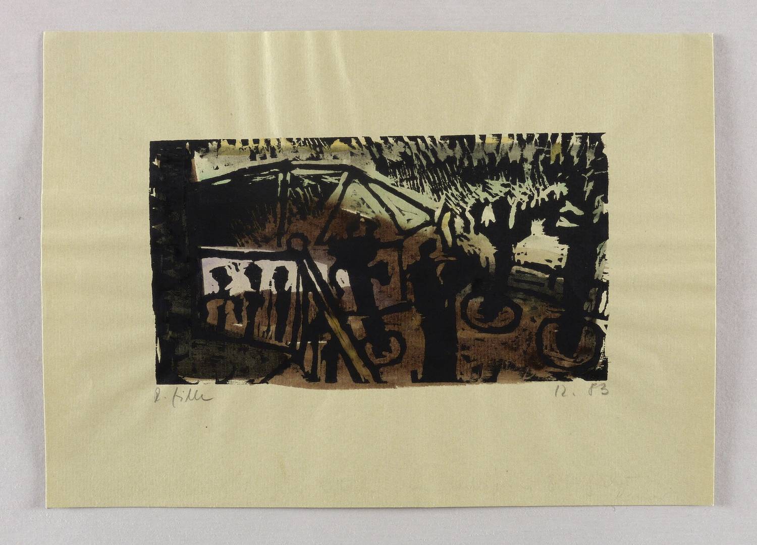 1983. Holzschnitt, in Schwarz, aquarelliert, auf graubraun getöntem Maschinenbütten. – Originale Künstlergrafik, von Rainer Zille. – Unikat. – 11,0 x 20,2 cm (Darstellung / Druckstock), 21 x 30 cm (Blatt).