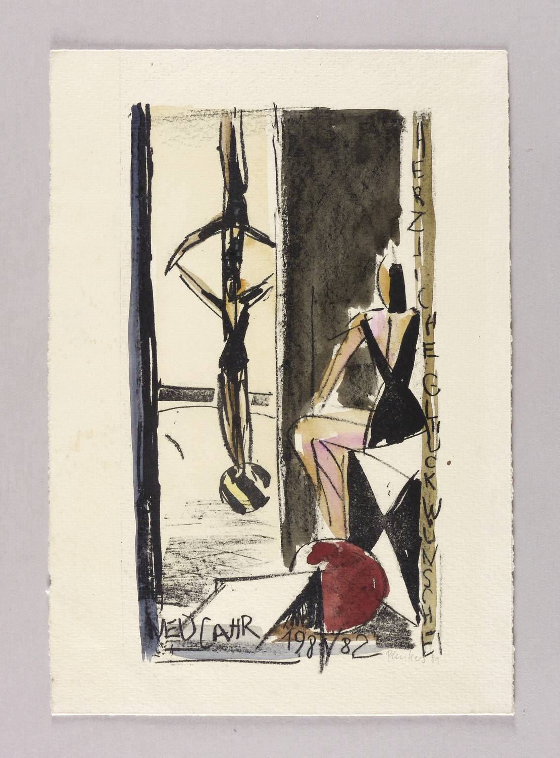1981. Lithografie / Kreide- & Pinsellithografie, in Schwarz, aquarelliert, auf weichem hellchamois Velin. – Originale Künstlergrafik, von Stefan Plenkers. – 25,5 x 14,0 cm (Darstellung / Druckbild), 30 x 21 cm (Blatt).
