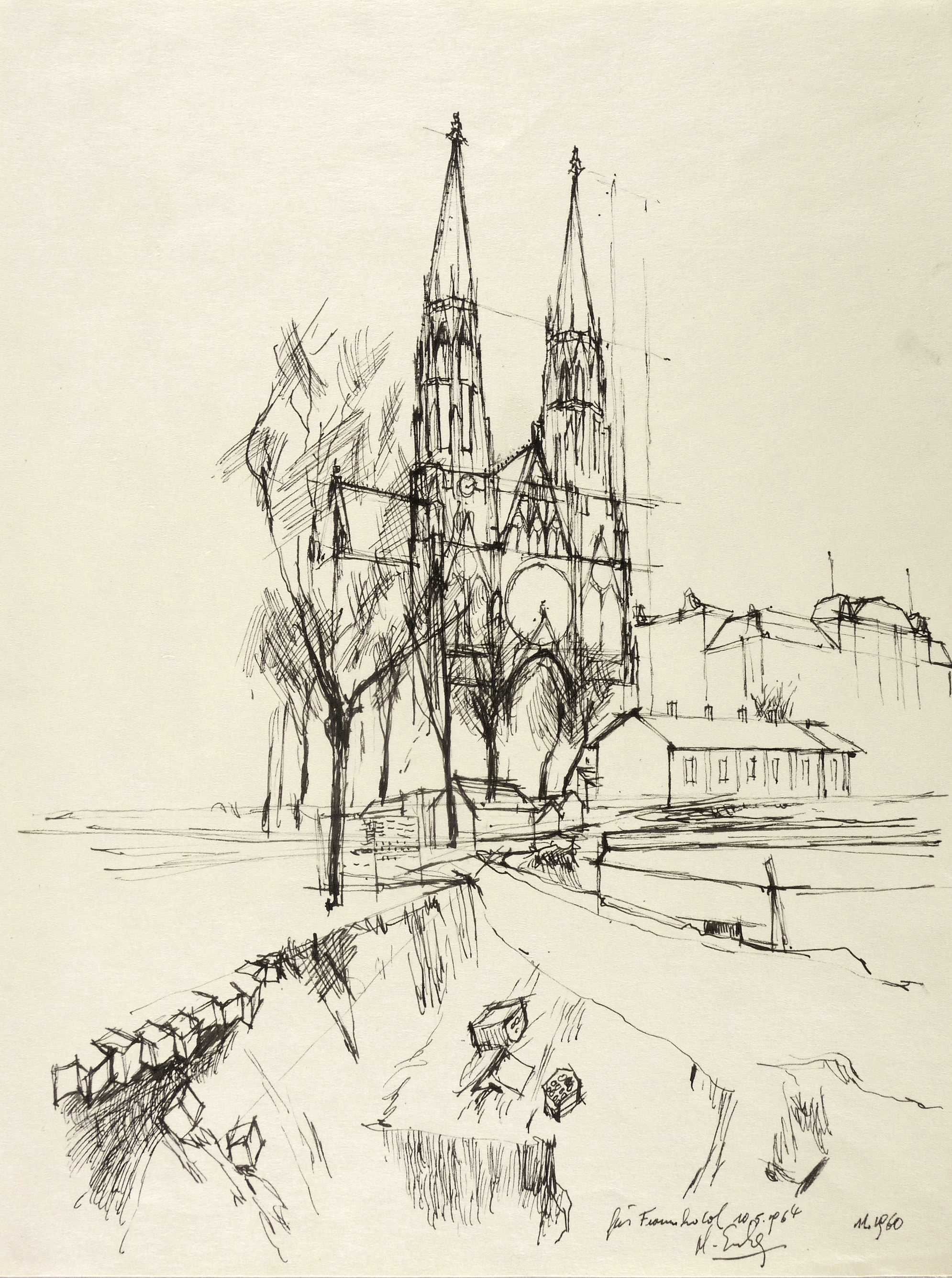 1960. Zeichnung / Federzeichnung, in schwarzer Tusche, auf glattem hellchamois Velin. – Originale Künstlergrafik, von Georg Eisler. – Unikat. – 26,8 x 20,4 cm (Darstellung / Blatt).