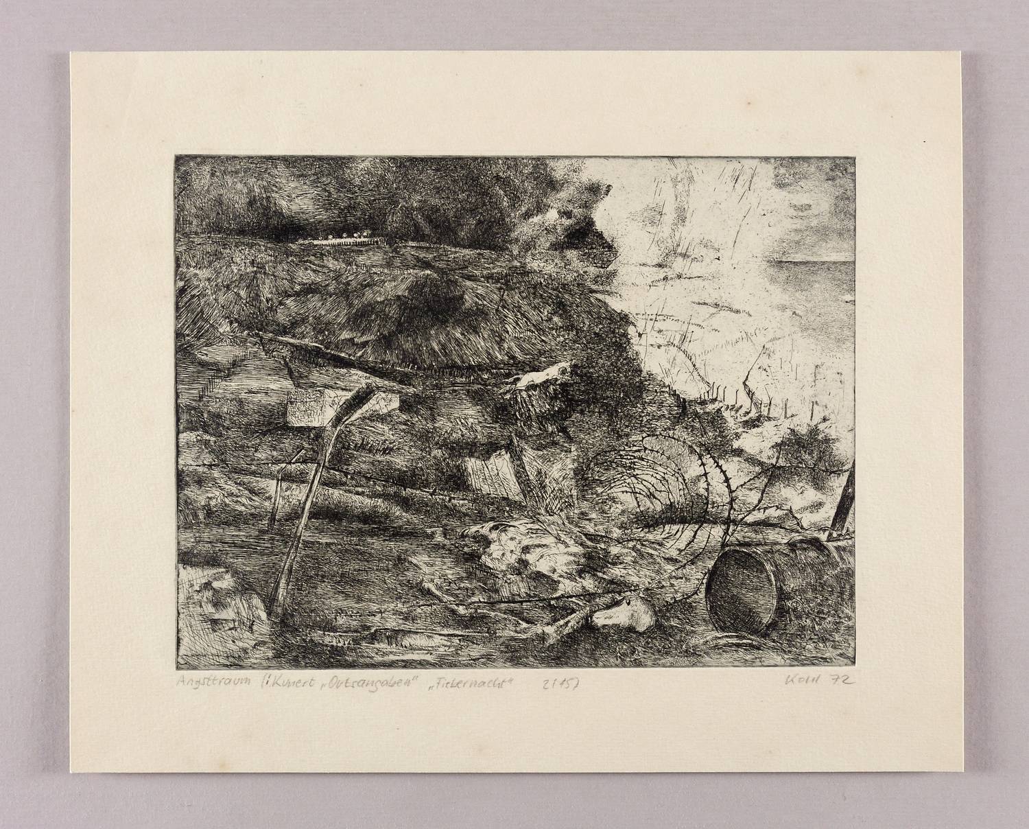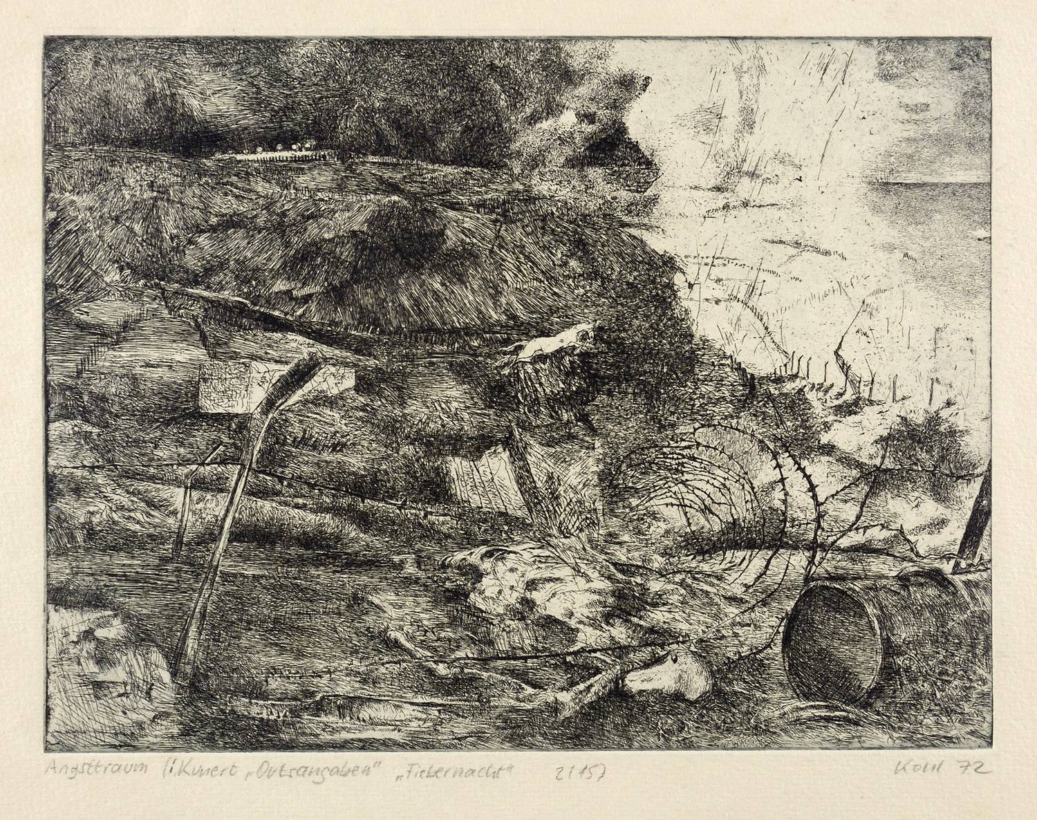 Rechts unten in Bleistift signiert und datiert. ″Kohl 72″. Links bezeichnet: ″Angsttraum (Kunert 'Ortsangaben' 'Fiebernacht' 2/15)″. – Im Papierrand etwas fleckig. Mäßig guter Zustand.