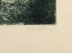 1917. Radierung / Strichätzung, mit Plattenton, in Schwarzblau, auf gelbem Velinkarton. – Originale Künstlergrafik, von Ferdinand Steiniger. – 25,0 x 30,3 cm (Darstellung / Platte), 34 x 46 cm (Blatt).