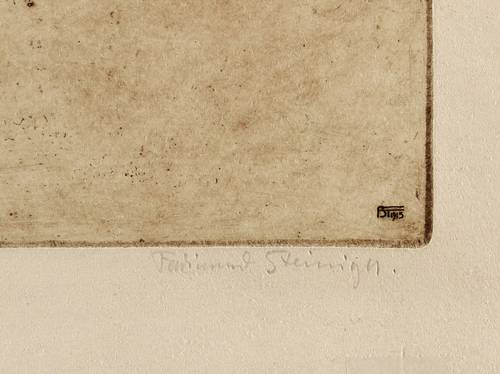 1915. Radierung / Strichätzung, mit Plattenton, in Schwarzbraun, auf gelbem Velinkarton. – Originale Künstlergrafik, von Ferdinand Steiniger. – 29,8 x 39,2 cm (Darstellung / Platte), 35 x 47 cm (Blatt).