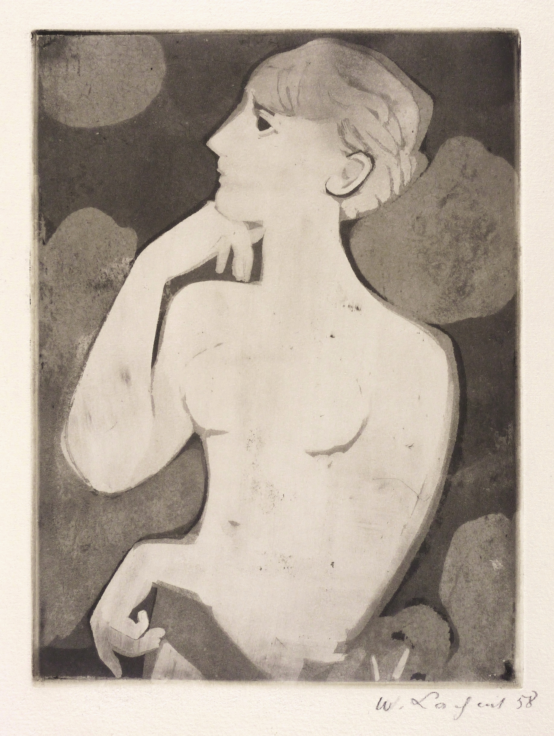 1958. Radierung / Aquatinta, in Schwarz, auf festem hellgelbem Velinkarton. – Originale Künstlergrafik, von Wilhelm Lachnit. – 24,8 x 18,5 cm (Darstellung / Platte), 34 x 27 cm (Blatt).