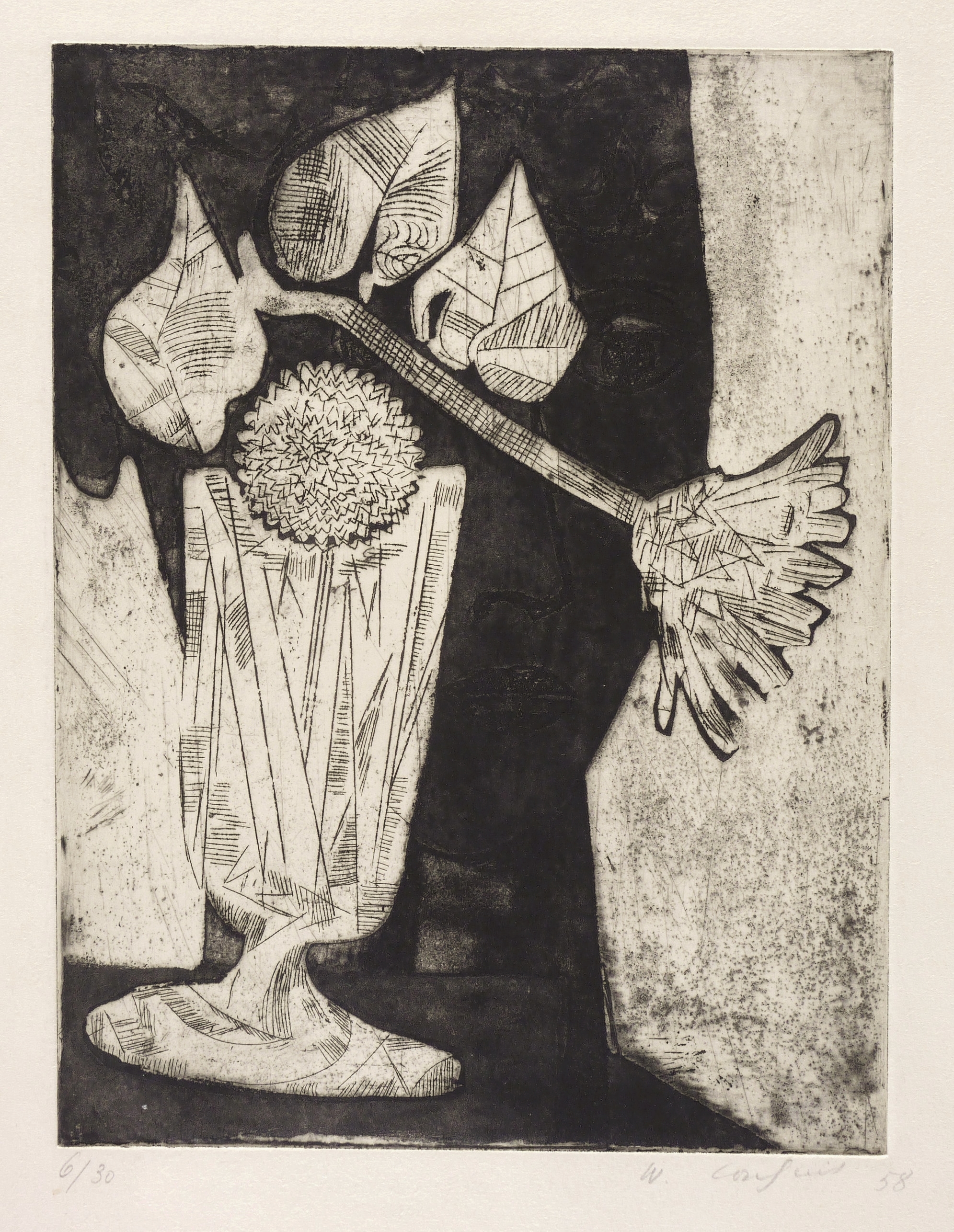 Rechts unten in Bleistift signiert und datiert: ″W. Lachnit 58″. Links Auflagenbezeichnung: ″6/30″. Verso im oberen Rand bezeichnet: ″Blumenglas vor dunklem Kopf″. – Sehr guter Zustand.