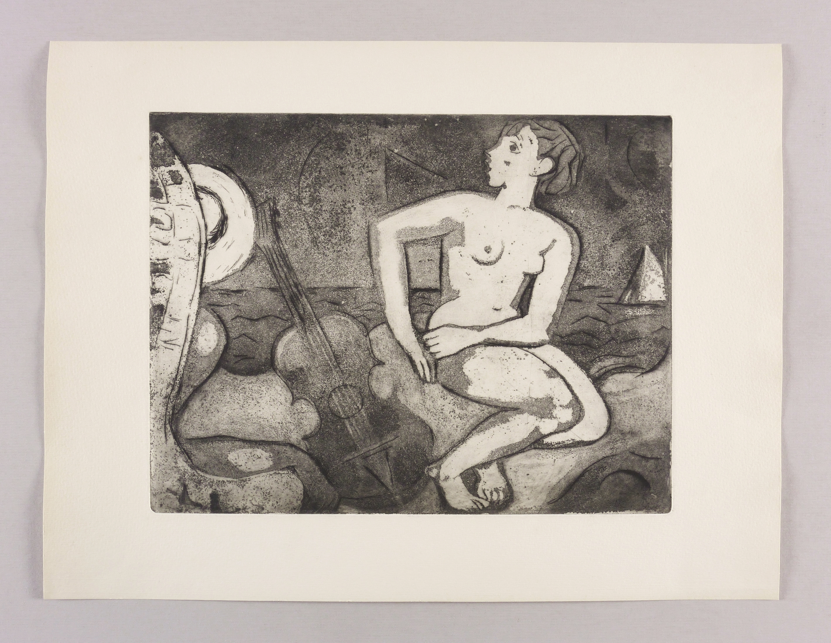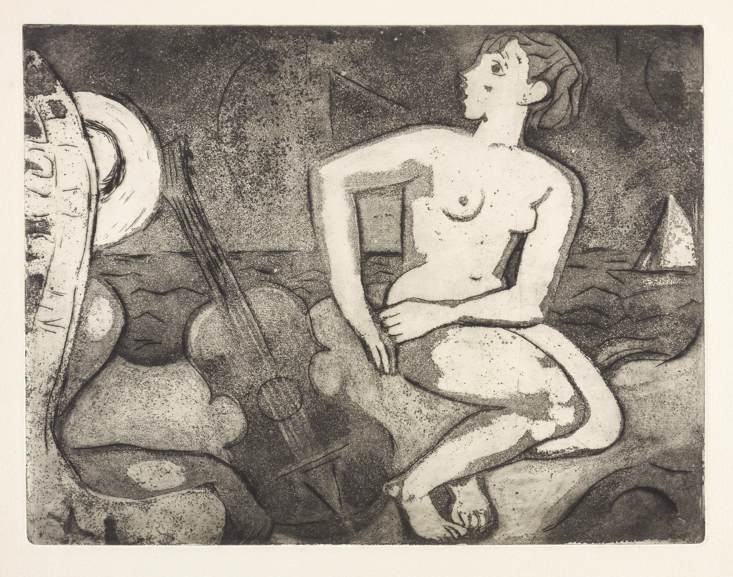 1959. Radierung / Aquatinta & Strichätzung, in Schwarz, auf gelblichem Velinkarton. – Originale Künstlergrafik, von Wilhelm Lachnit. – 24,7 x 32,3 cm (Darstellung / Platte), 35 x 46 cm (Blatt).