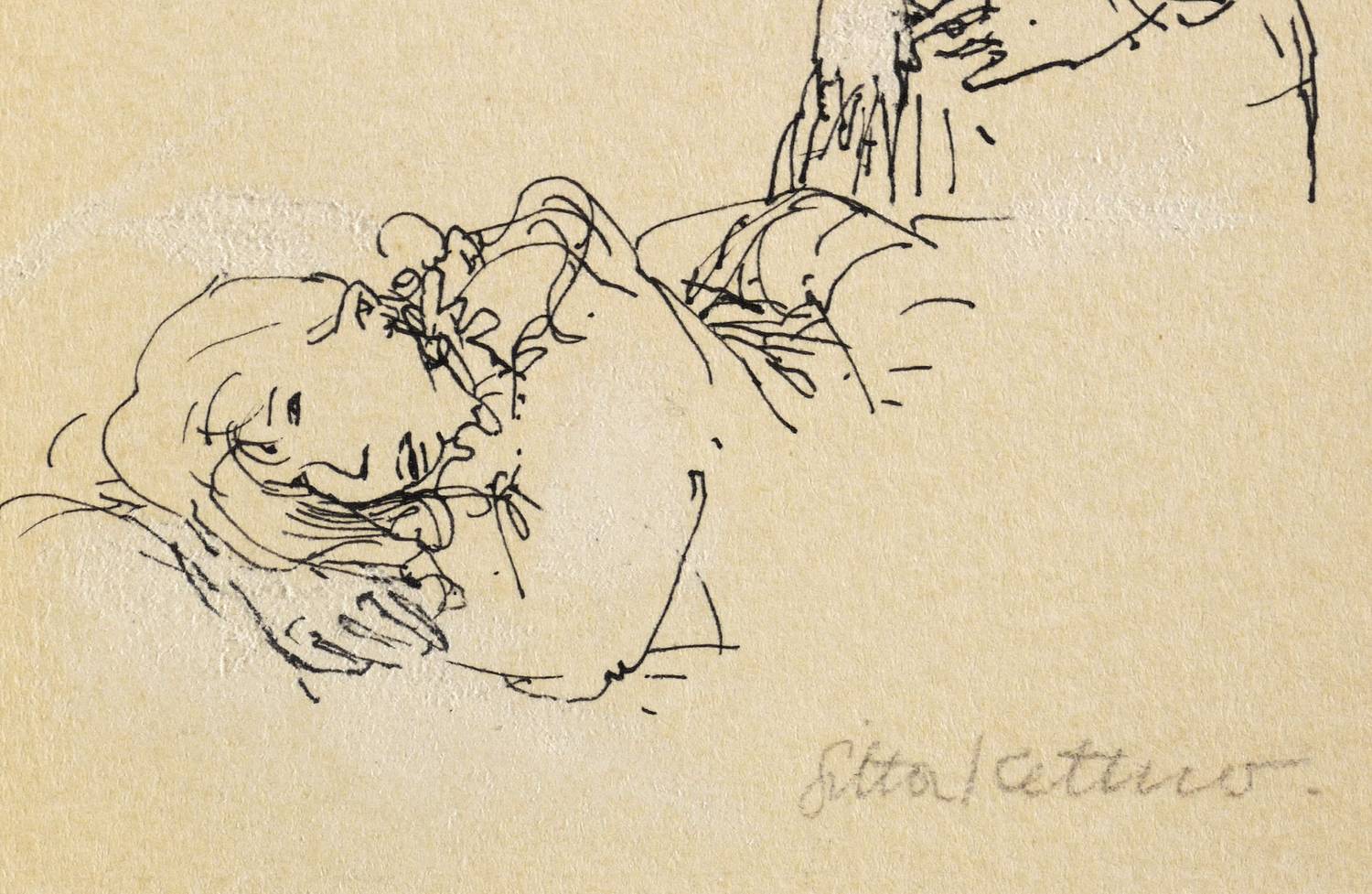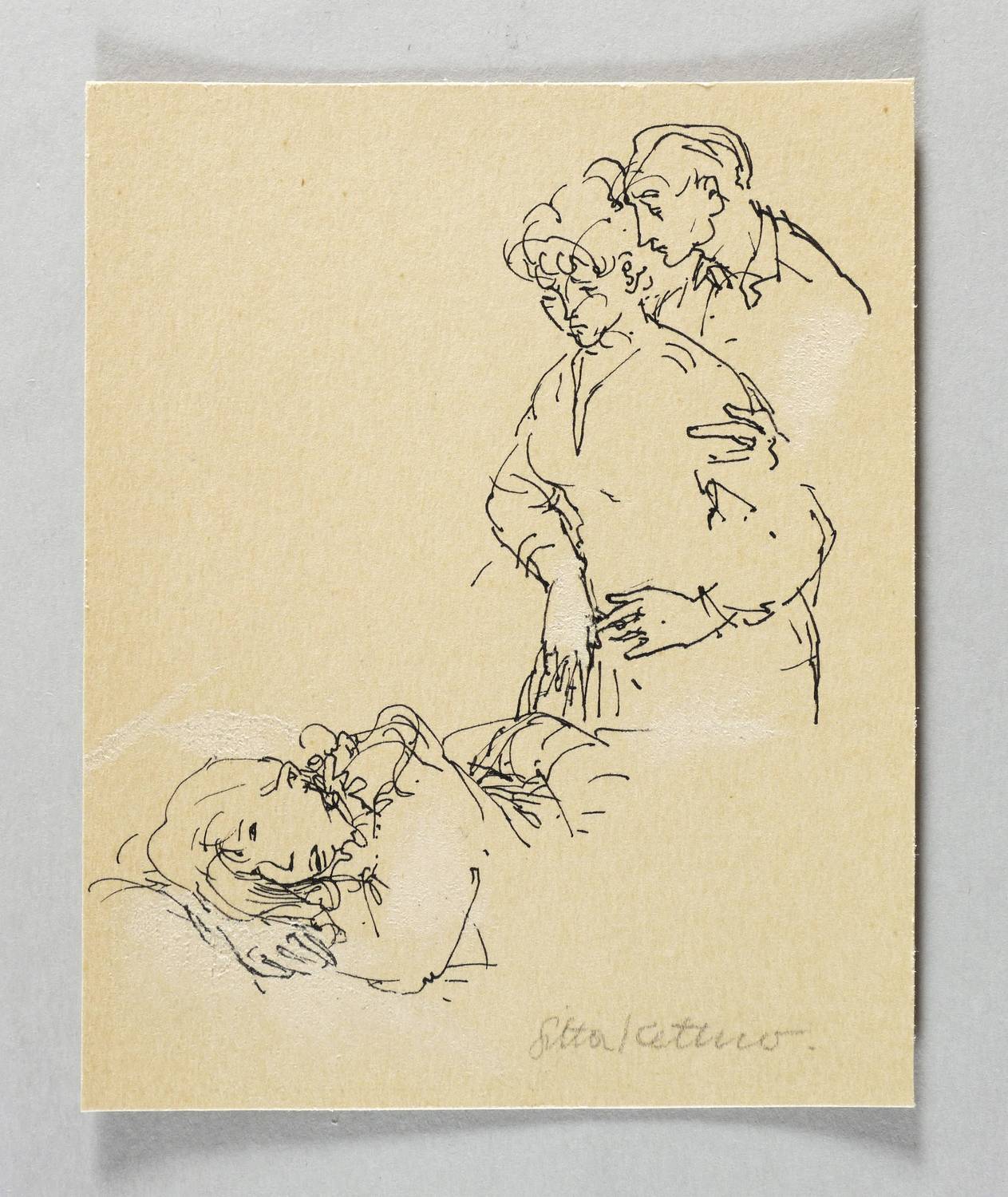 1970-1980. Zeichnung / Federzeichnung, in schwarzer Tusche, auf gelbem Karton. – Originale Künstlergrafik, von Gitta Kettner. – Unikat. – 9,8 x 8,6 cm (Darstellung), 11,5 x 9,2 cm (Blatt).