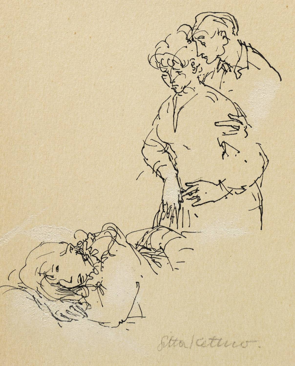 Links unten in Bleistift signiert: ″Gitta Kettner″. – Verso Reste einer Klebemontierung, vorn leicht hell durchschlagend. Im unteren Bereich oberflächlciher Wurmfraß. Mangelhafter Zustand.