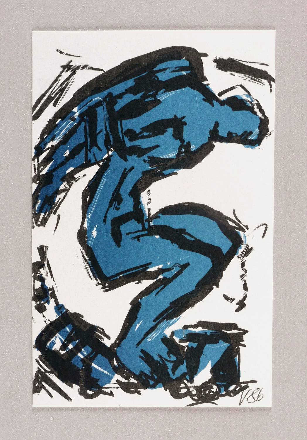 1986. Farbsiebdruck / Farbserigrafie, in Blau & Schwarz, auf festem weißem Velinkarton. – Originale Künstlergrafik, von Frank Voigt. – 14,7 x 9,5 cm (Darstellung / Blatt).