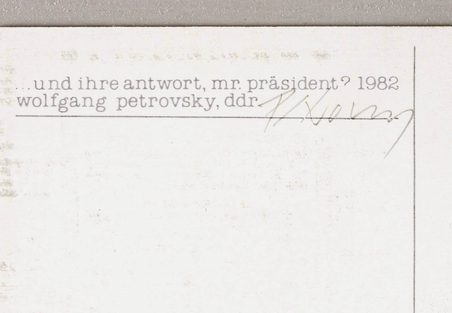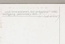 Wolfgang Petrovsky (*1947 Hainsberg, lebt und arbeitet in Hainsberg und Bitterfeld). Deutscher Maler, Grafiker und Projektkünstler. 1966-70 Studium am Institut der Kunsterziehung an der Karl-Marx-Universität Leipzig. Seit 1979 freischaffender Künstler. 1979 Studienreise nach Mittelasien (Sowjetunion) und Beginn des "Bitterfeldprojekts". Umsetzung politischer Themen: 1980 Postkartenserie "Signale" gegen Raketenstationierung in Ost und West, 1982 Projekt "aktion=hoffnung", 1983 Buch-Aktion "FREEZE". Seit 1982 Freundschaft und zeitweilige Zusammenarbeit mit dem Maler und Grafiker Frank Voigt. 1986 Postkartenprojekt "made in germany und anderswo / für Victor Klemperer". 1987 Postkartenserie zur Perestroika "DA". 1989 Mail-Art-Aktion "Erinnerung 1. September 1939". 1989 Mitbegründer des Kunstvereins Bitterfeld-Wolfen und Mitinitiator des Aufrufs "Künstler für Bitterfeld". 1990 Arbeitsaufenthalt in Japan. 1990-93 Lehraufträge an den Hochschulen für Bildende Künste in Dresden und Hamburg sowie an der Fakultät Architektur der Technischen Universität Dresden. 1990/91 und '94 Beteiligung an den Projekten "Fahne" in der Villa Streccius des Kunstvereins Landau und "Flagge zeigen" der Edition Staeck Heidelberg. 1996 Arbeit an Collagen zu Kurt Heilbut. 2000 Studienaufenthalt auf Schloss Wiepersdorf mit dem Komponisten Hartmut Dorschner, Arbeit am Projekt "BILD-TEXT-KLANG-KOMPOSITIONEN". 2000 Artist in Residence der Universität Erfurt.