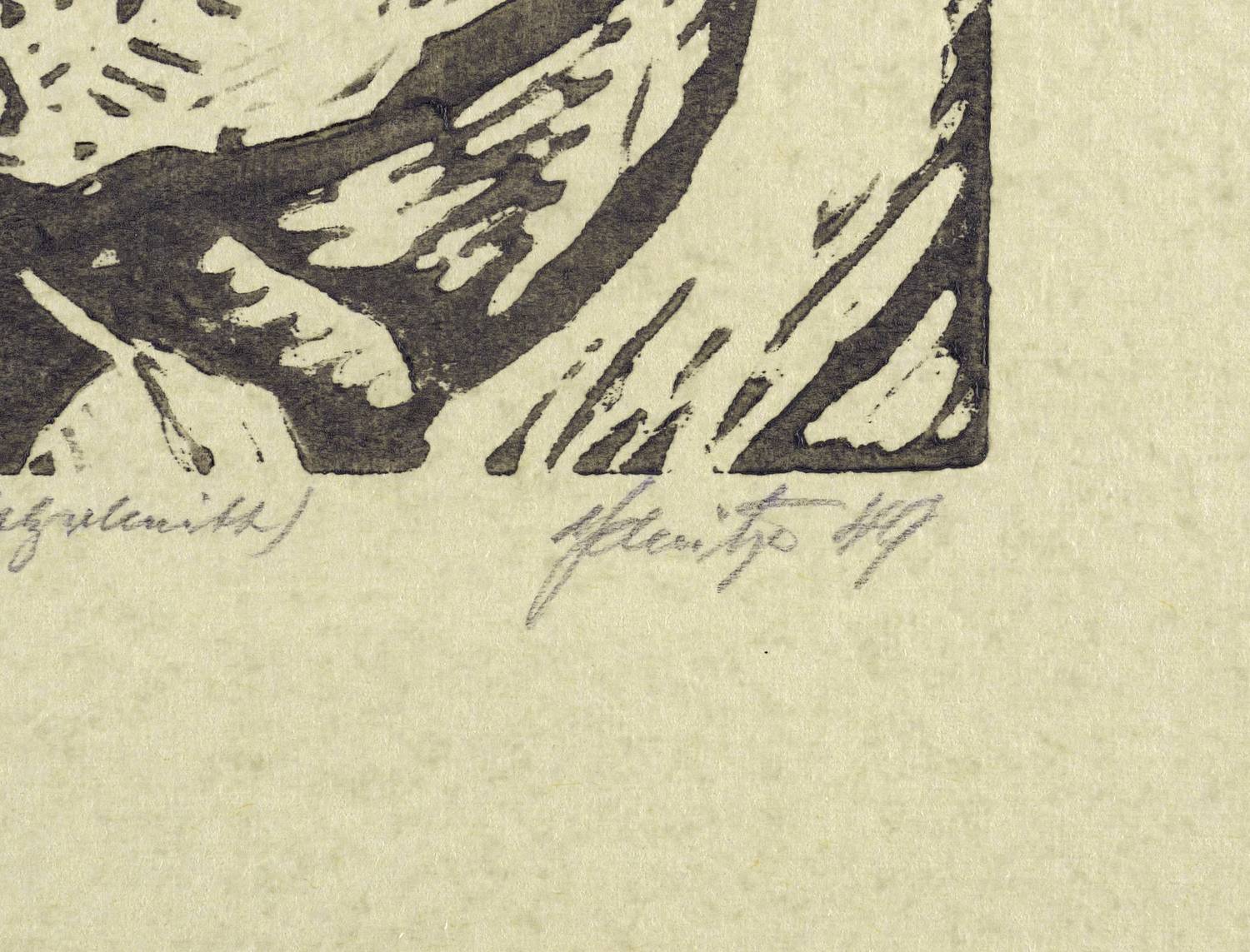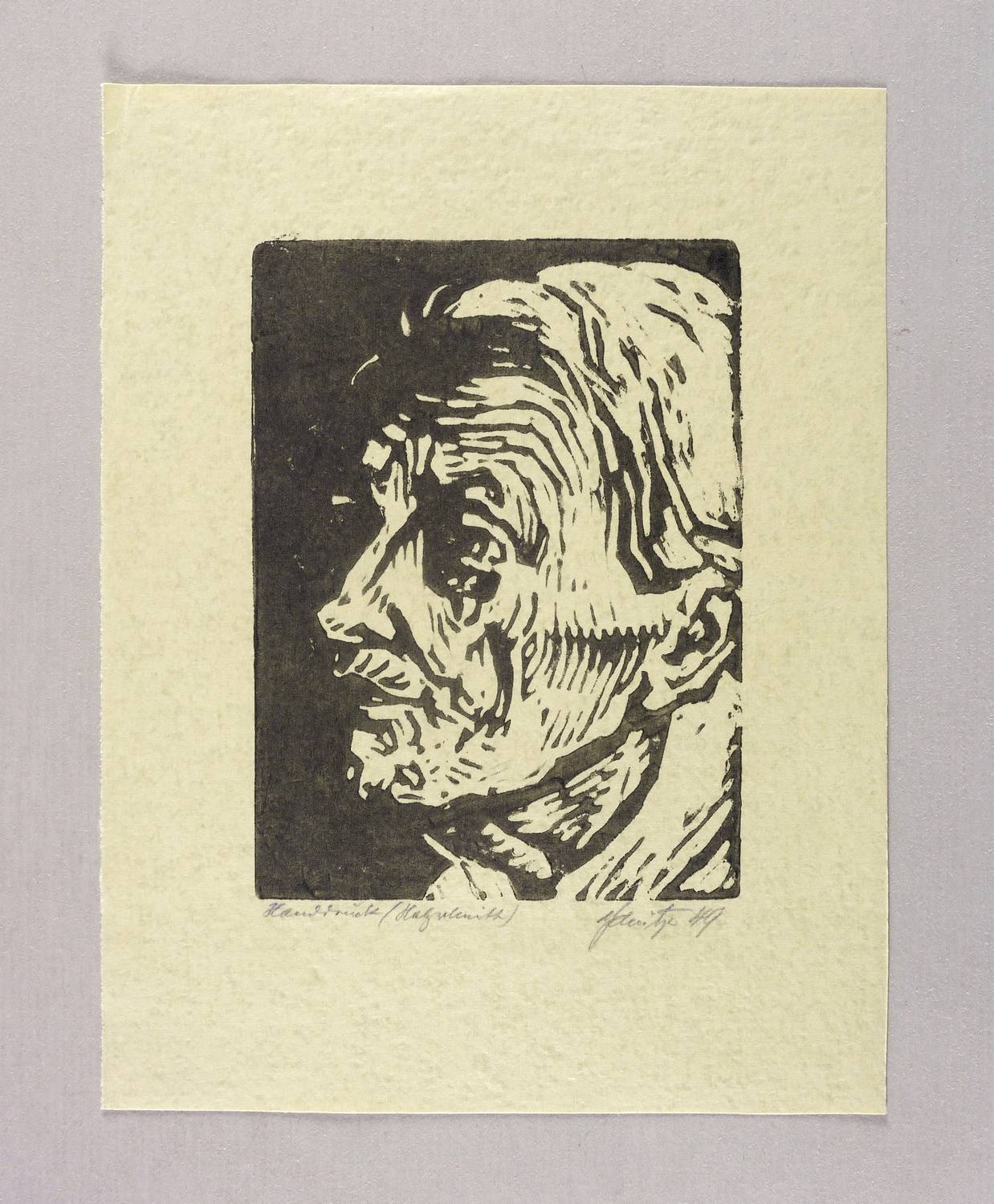 Rechts unten in Bleistift signiert und datiert: ″A. Schütze 49″. Links bezeichnet: ″Handdruck (Holzschnitt)″. – Sehr guter Zustand.