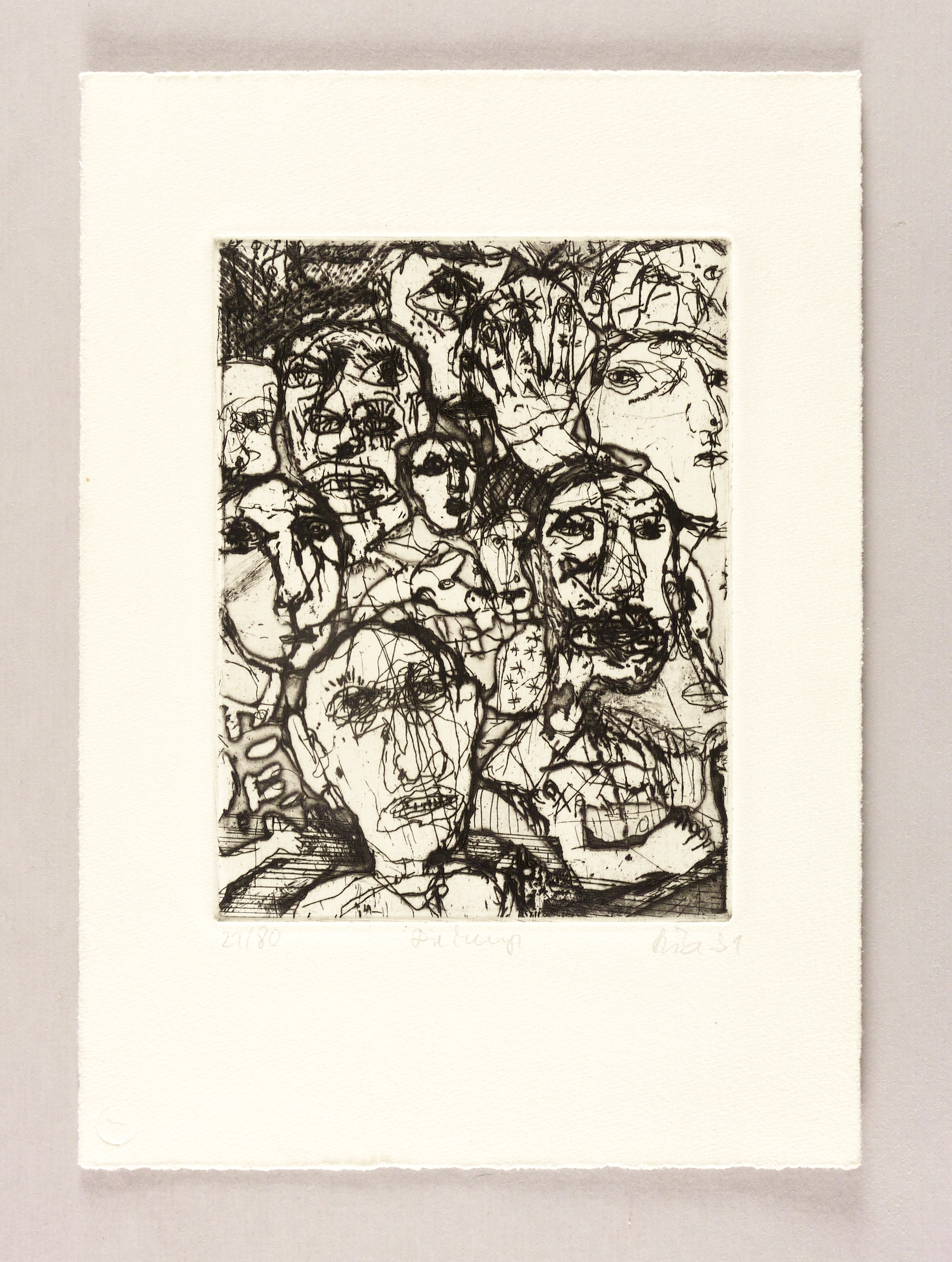 Rechts unten in Bleistift signiert und datiert: ″Lieb. 81″. Links Auflagenbezeichnung: ″21/80″. Mittig Titel: ″De Menge″. – Sehr guter Zustand.