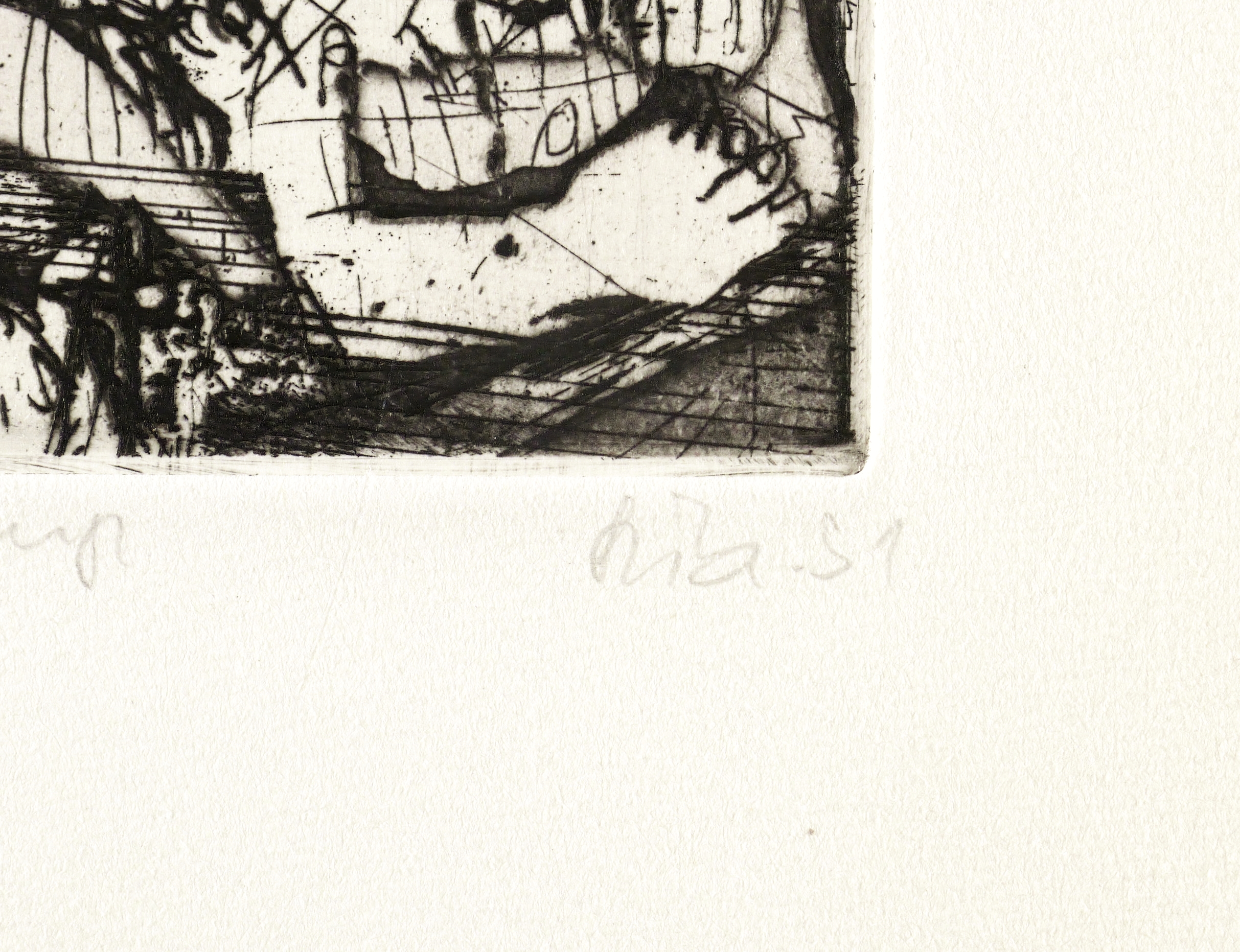 1981. Radierung / Strichätzung, in Schwarz, auf kräftigem hellchamois Velin. – Originale Künstlergrafik, von Werner Liebmann. – Auflage Exemplar Nr. 21/80. – 17,7 x 13,3 cm (Darstellung / Platte), 29 x 20 cm (Blatt).