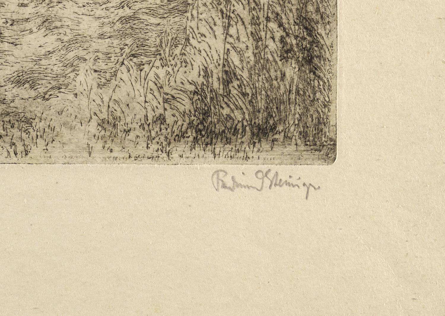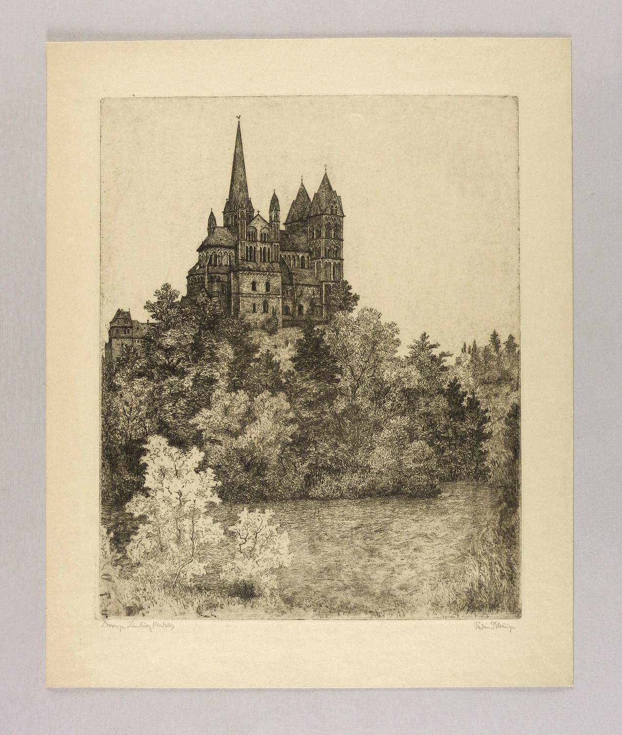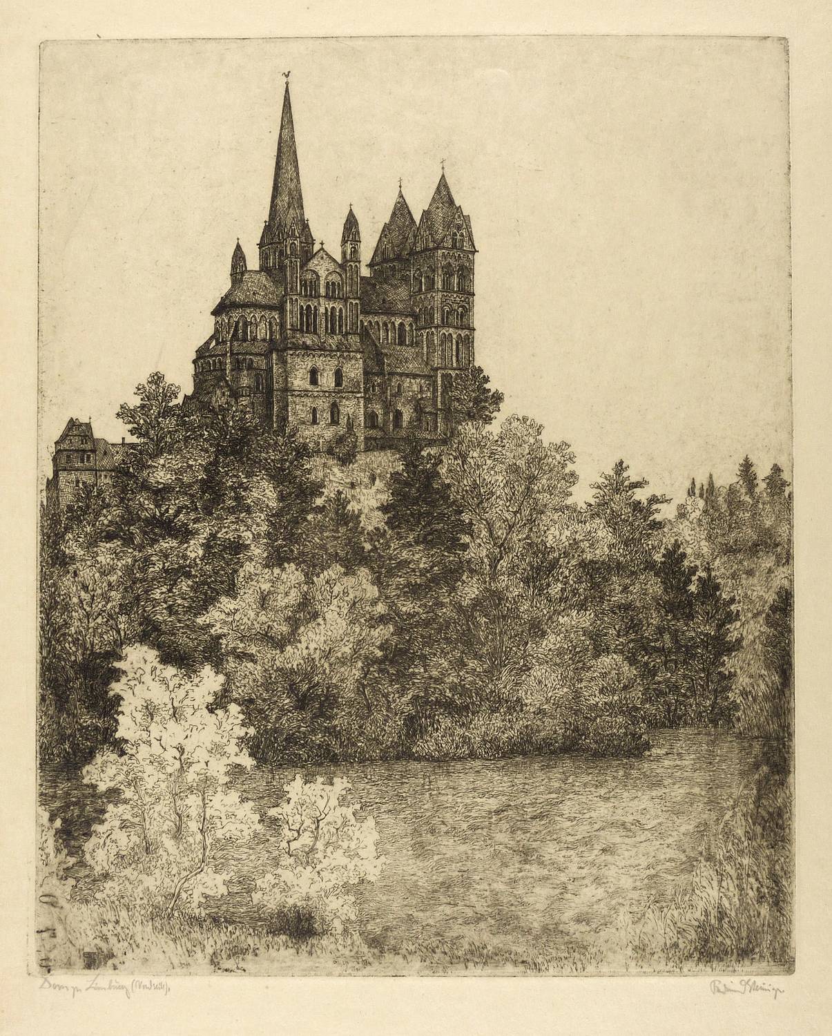 Rechts unten in Bleistift signiert: ″Ferdinand Steiniger.″ Links Titel: ″Dom zu Limburg (Nordseite).″ In der Platte links unten Monogramm und Jahr: ″FST 1928″. – Tadellos. Sehr guter Zustand.