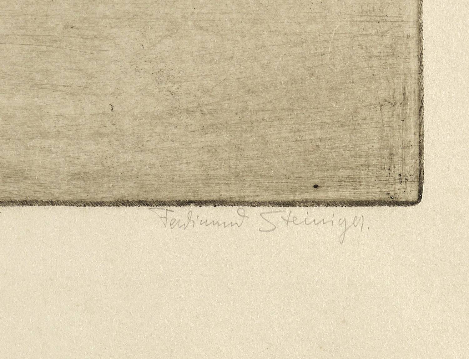 Rechts unten in Bleistift signiert: ″Ferdinand Steiniger.″ Links Titel: ″Bildnis meiner Mutter.″ In der Platte links unten Monogramm und Jahr: ″FST 1912″. – Papier mit Altersspuren. Sonst guter Zustand.