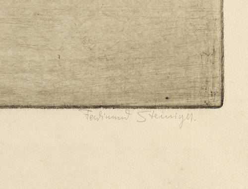 1912. Radierung / Strichätzung, mit Plattenton, in Schwarzbraun, auf gelbem Velinkarton. – Originale Künstlergrafik, von Ferdinand Steiniger. – 41,7 x 29,8 cm (Darstellung / Platte), 50 x 37 cm (Blatt).