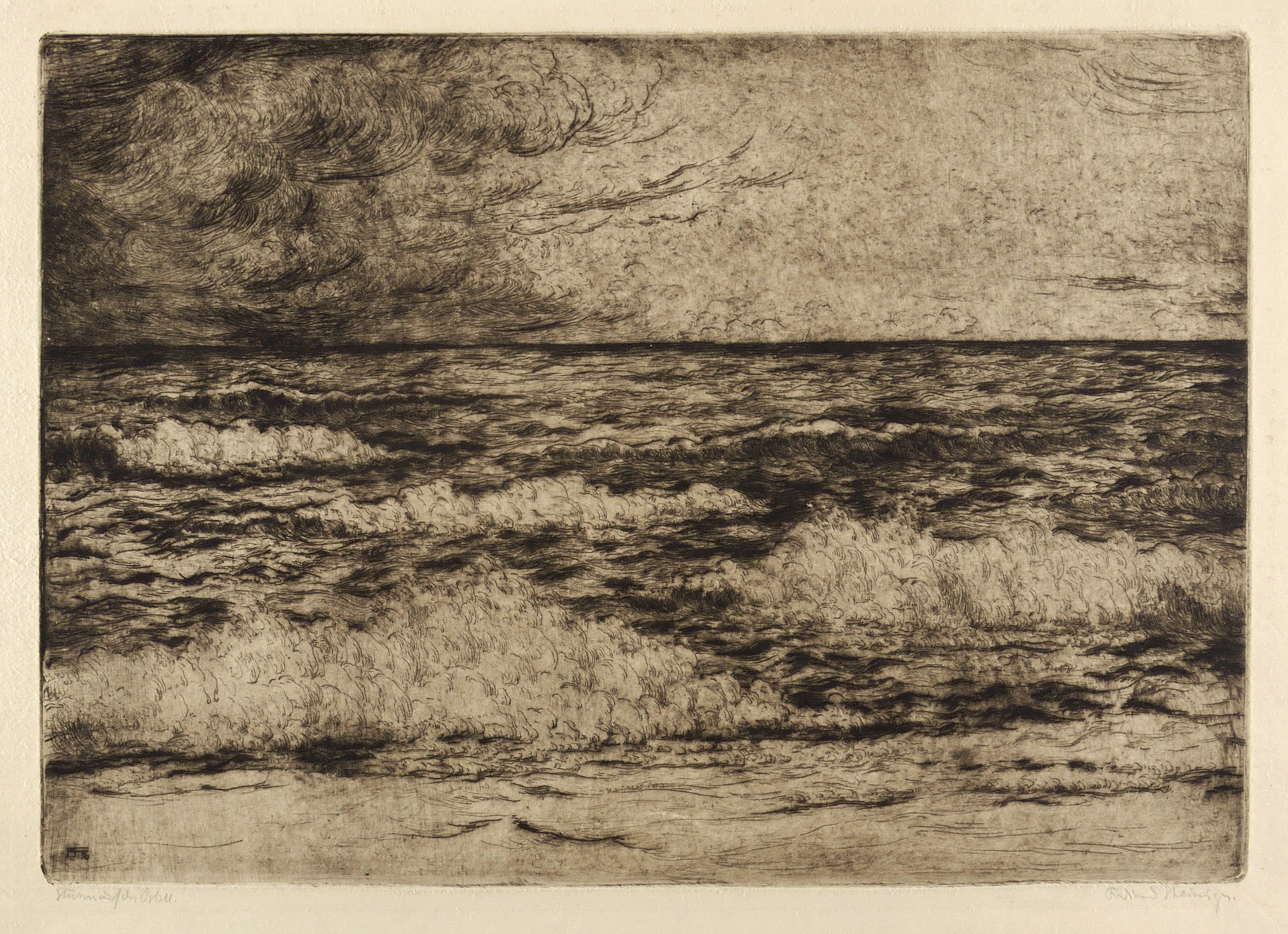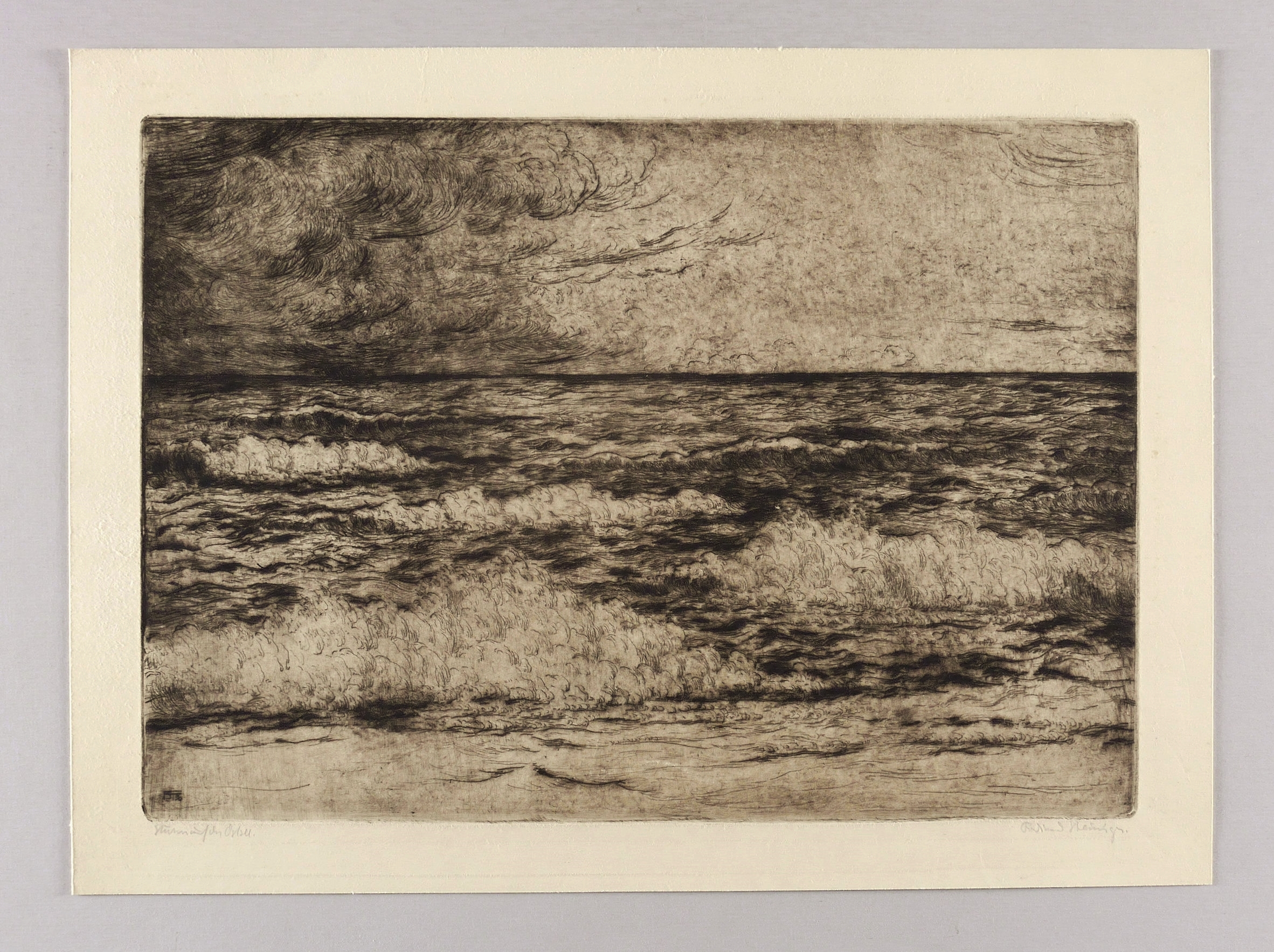 Rechts unten in Bleistift signiert: ″Ferdinand Steiniger.″ Links Titel: ″Sturm auf der Ostsee.″ In der Platte links unten Monogramm und Jahr: ″FST 36″. – Sehr guter Zustand.
