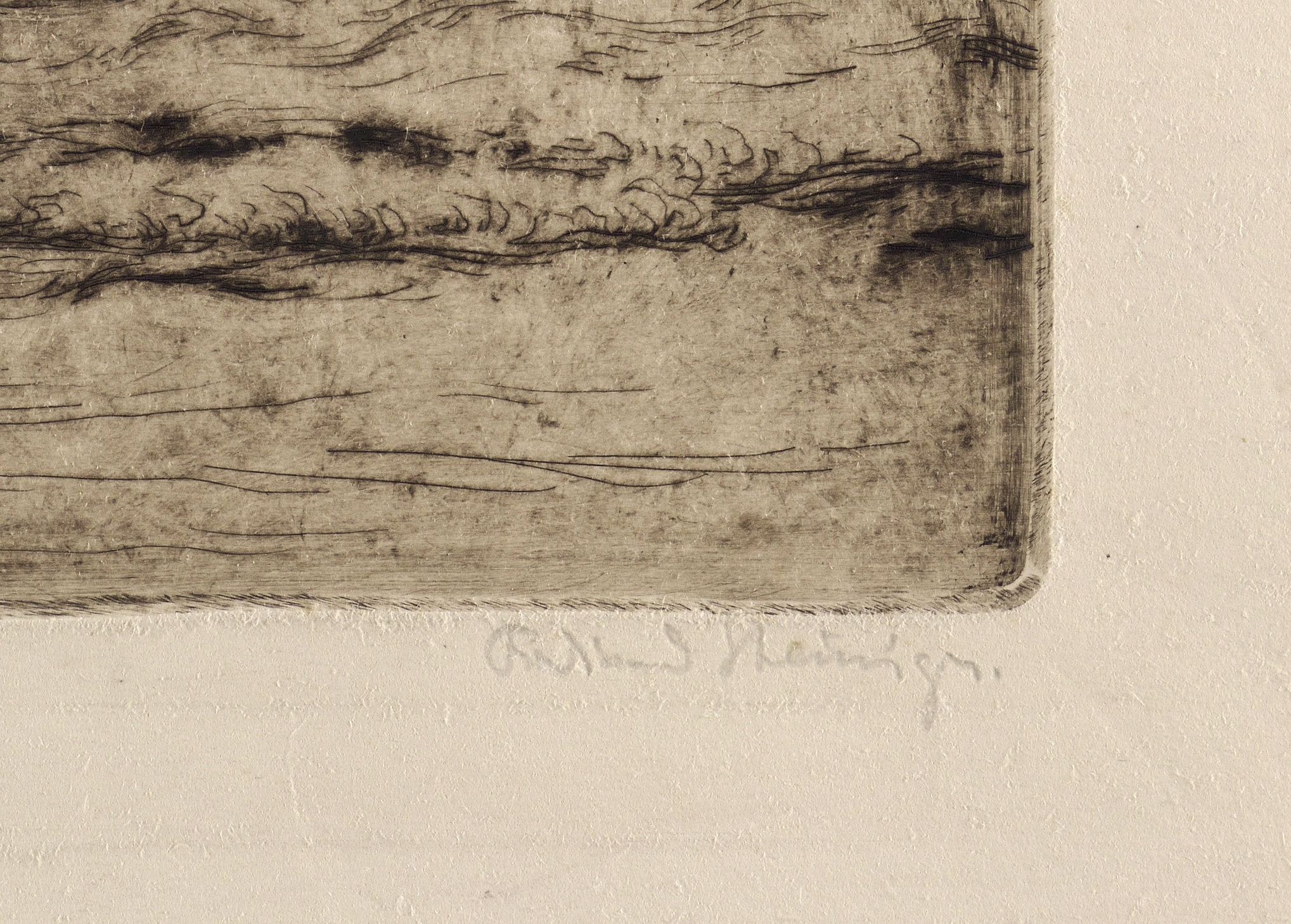 1936. Radierung / Strichätzung, mit Plattenton, in Schwarzviolett, auf weichem gelbem Velin. – Originale Künstlergrafik, von Ferdinand Steiniger. – 29,6 x 41,8 cm (Darstellung / Platte), 36 x 48 cm (Blatt).