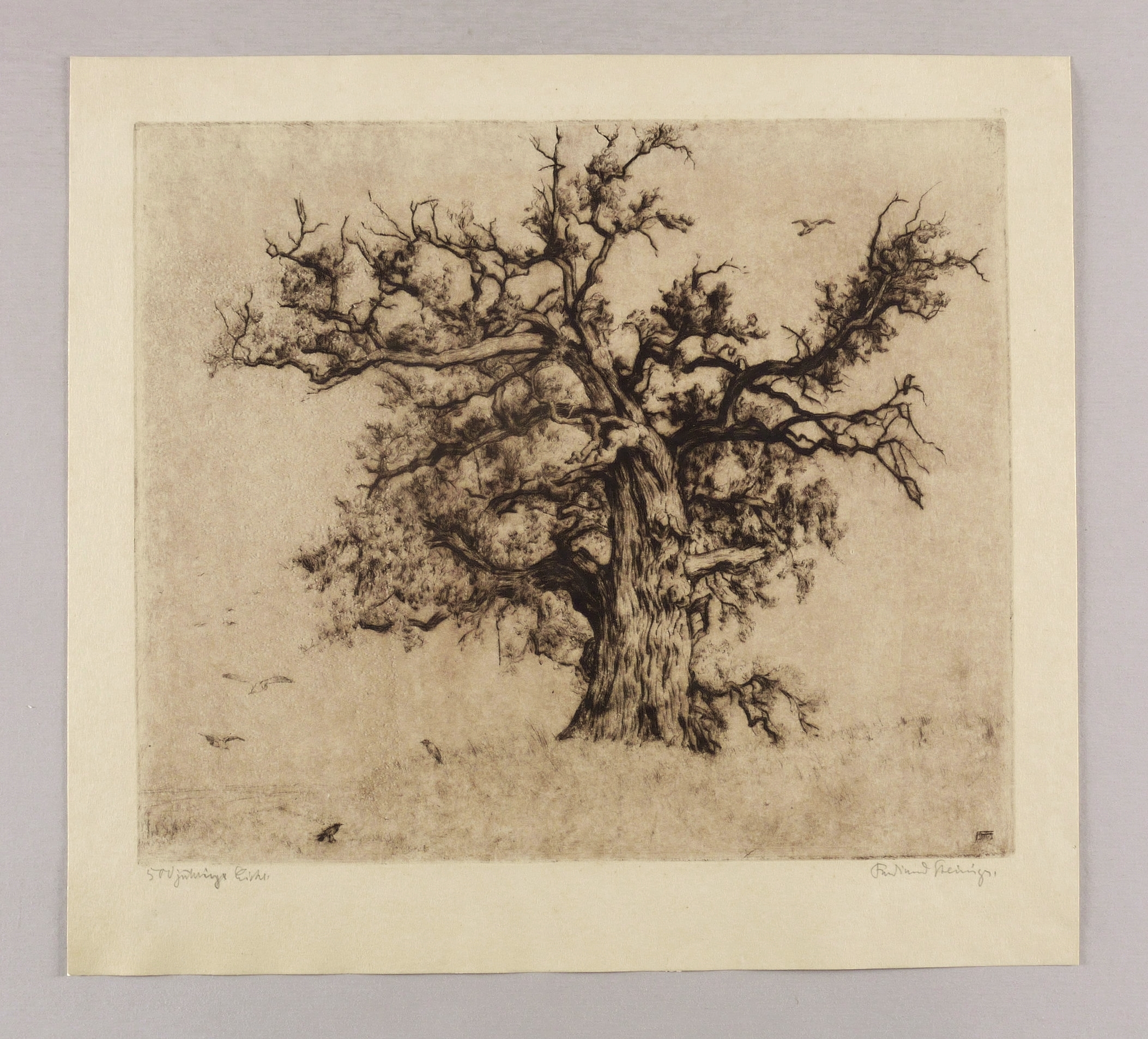 Rechts unten in Bleistift signiert: ″Ferdinand Steiniger.″ Links Titel: ″500jährige Eiche.″ In der Platte rechts unten Monogramm und Jahr: ″FST 1912″. – Sehr guter Zustand.