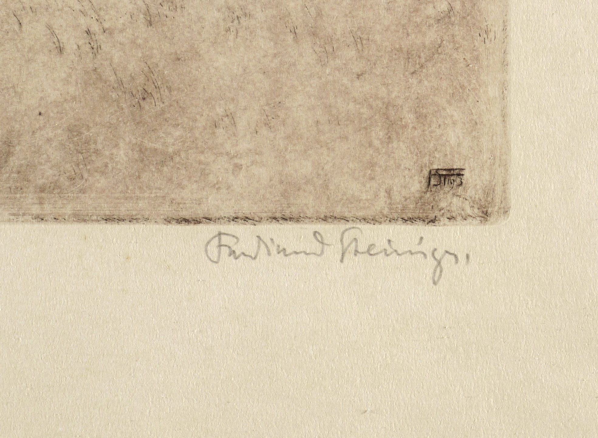 1912. Radierung / Strichätzung, mit Plattenton, in Schwarzbraun, auf gelbem Velinkarton. – Originale Künstlergrafik, von Ferdinand Steiniger. – 29,6 x 35,0 cm (Darstellung / Platte), 37 x 41 cm (Blatt).