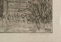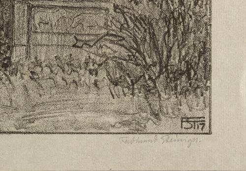 1917. Lithografie / Kreidelithografie, in Schwarz, auf grau getöntem Bütten. – Originale Künstlergrafik, von Ferdinand Steiniger. – 33,7 x 32,8 cm (Darstellung / Druckbild), 38 x 37 cm (Blatt).