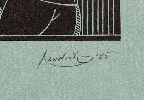 1985. Linolschnitt, in Schwarz, auf türkis getöntem Hahnemühle. – Originale Künstlergrafik, von Hendrik Hause. – Auflage Exemplar Nr. 1/13. – 14,3 x 22,0 cm (Darstellung / Druckbild), 22 x 28 cm (Blatt).