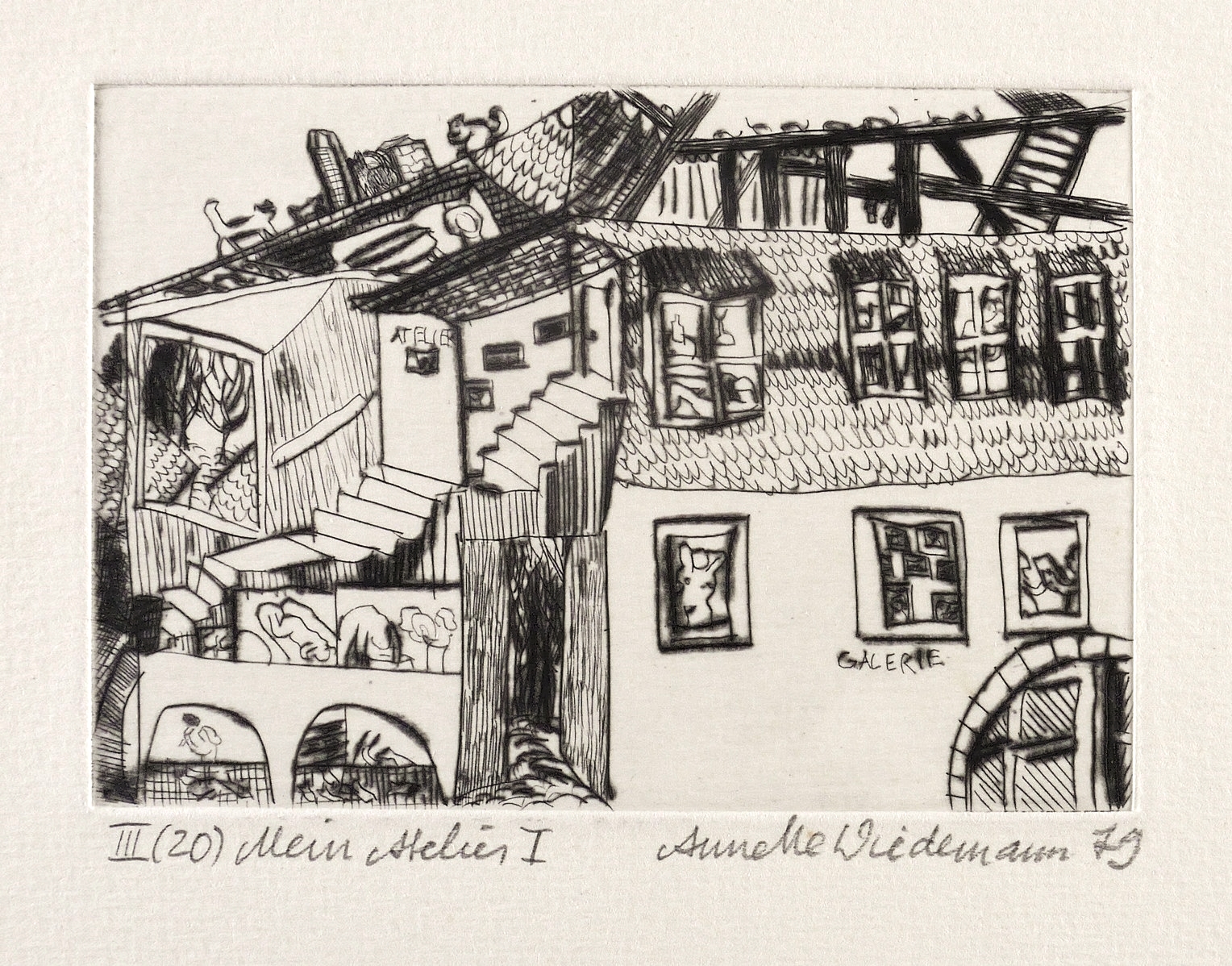 Rechts unten in Bleistift signiert und datiert: ″Annette Wiedemann 79″. Links Auflagenbezeichnung und Titel: ″III (20) Mein Atelier I″. – Sehr guter Zustand.